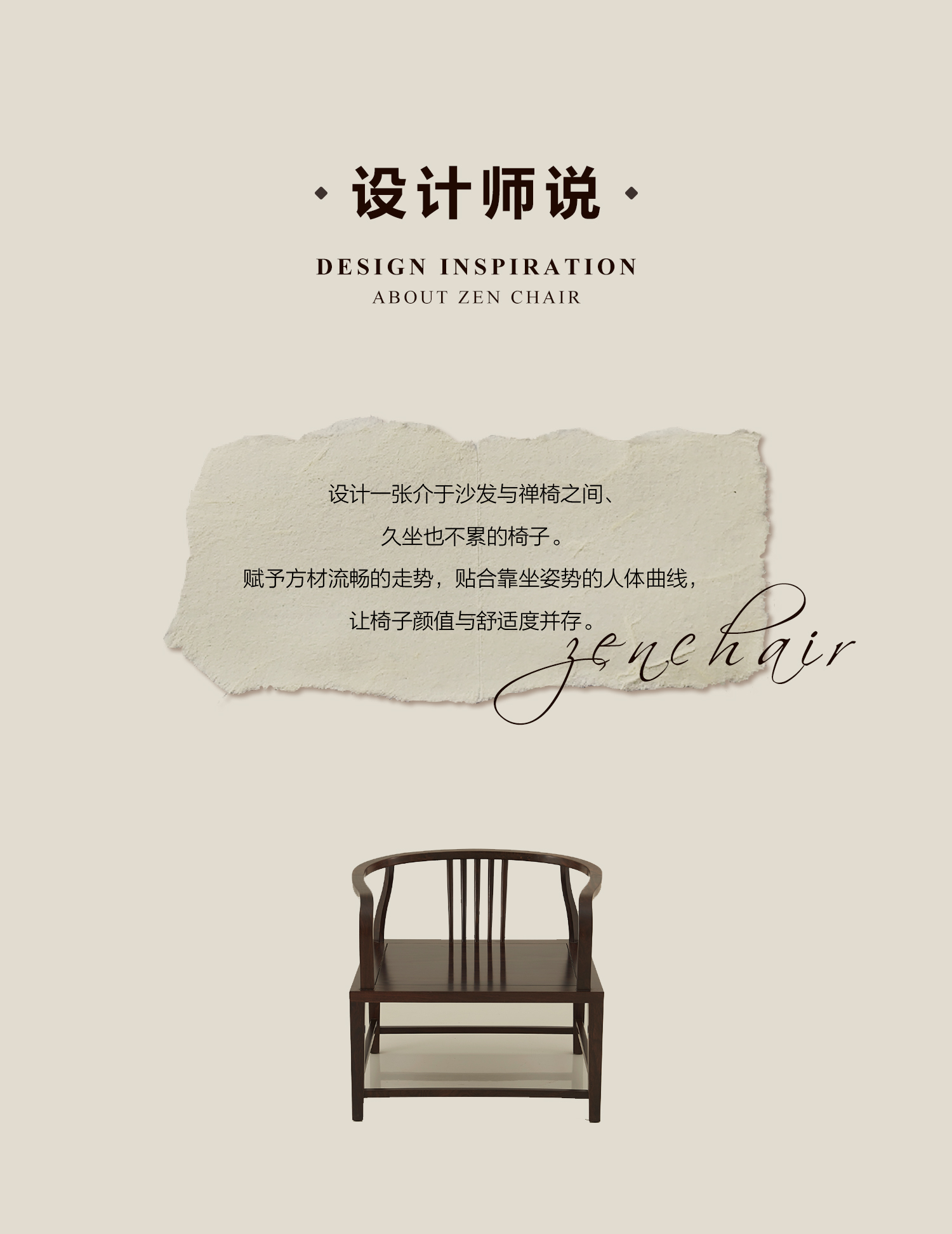 从传统禅椅、圈椅中提取元素并改良,把细易滑的圆柱扶手优化为平整宽阔的方形材,并切割打磨出流水般的曲线。经消费者实测,扶手弧度完全贴合手臂自然垂放的角度,形成平稳支撑。