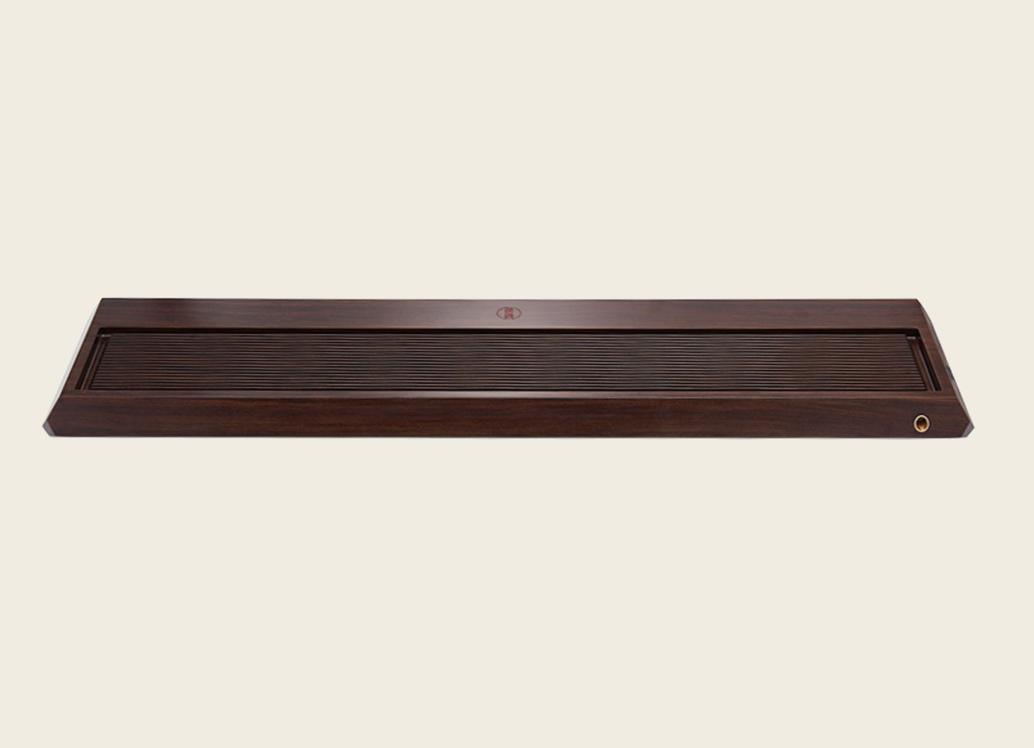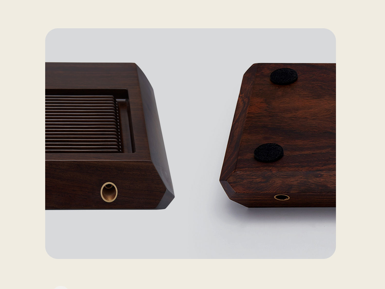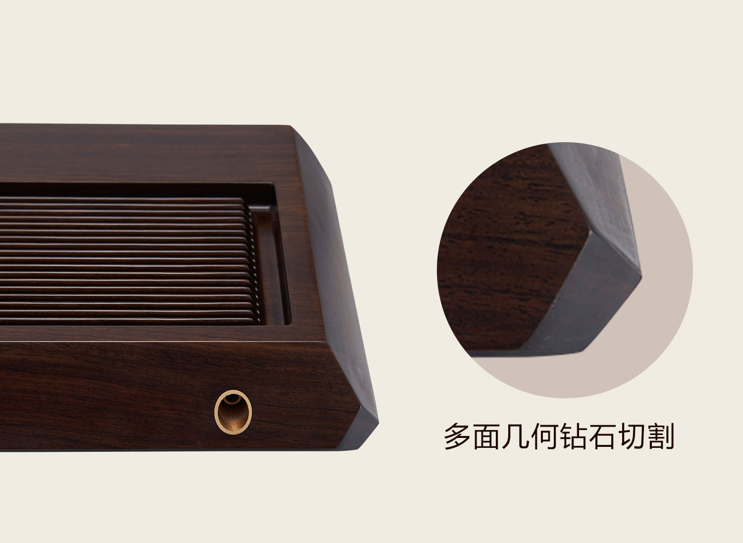 盘面合理分隔为茶杯放置区与泡茶落水格,齐整流丽的落水槽纹理通直,如根根琴弦,茶汤可直接落入排出,理想与艺术、几何与韵律随芬芳茶汤在琴弦中流淌跳动。
