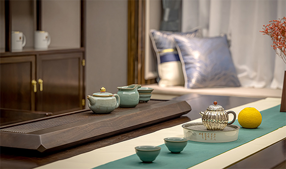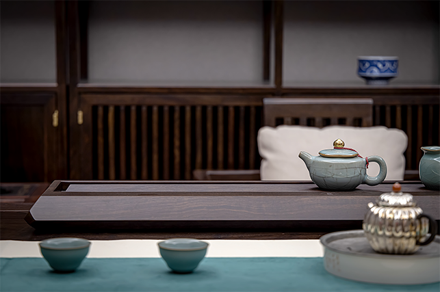 盘面合理分隔为茶杯放置区与泡茶落水格,齐整流丽的落水槽纹理通直,如根根琴弦,茶汤可直接落入排出,理想与艺术、几何与韵律随芬芳茶汤在琴弦中流淌跳动。