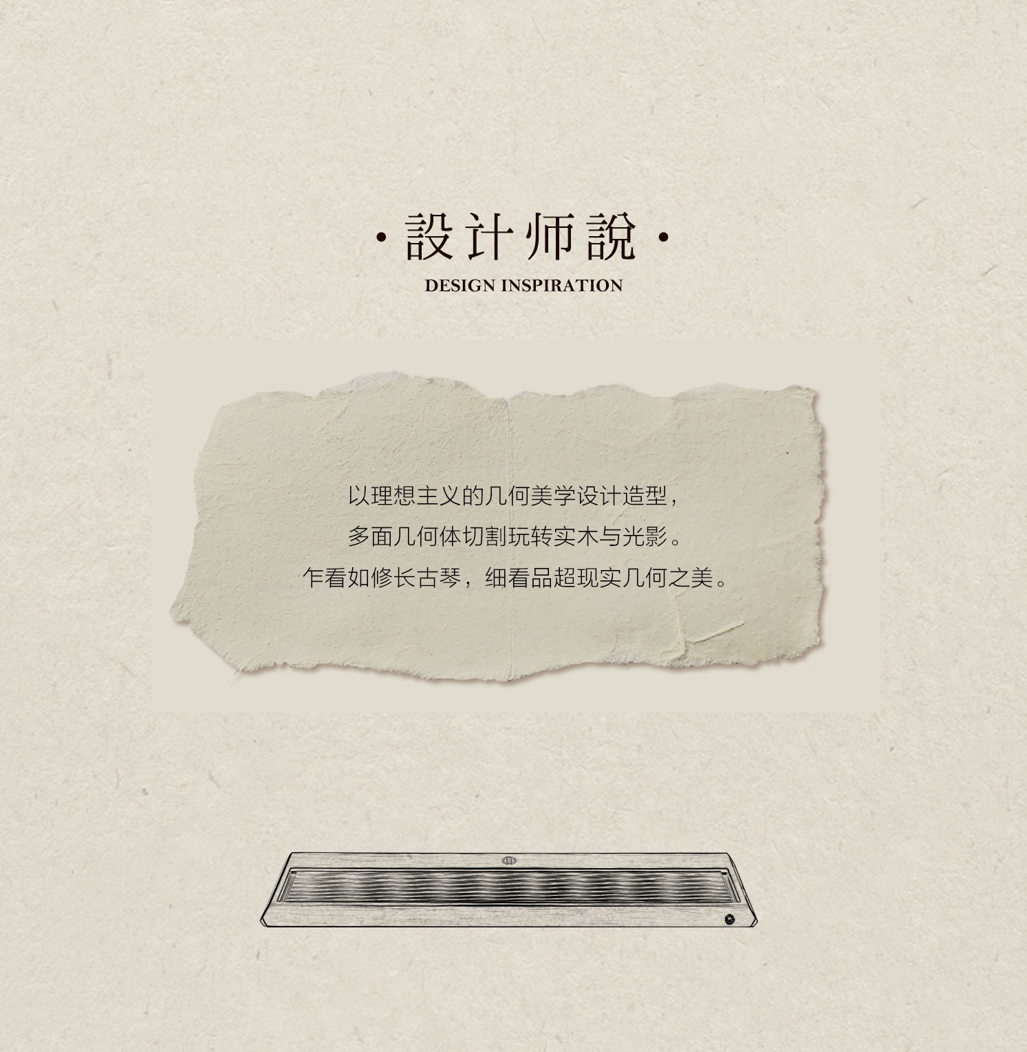 尚朴的基本形态是长方形,如一把修长古琴,但边角处以钻石切割法做多面切割,通过对棱角的设计处理,形成多边不规则造型,既不锋利尖锐,又催生了具有超现实感的视觉体验,多面光影简单中富有变化。
