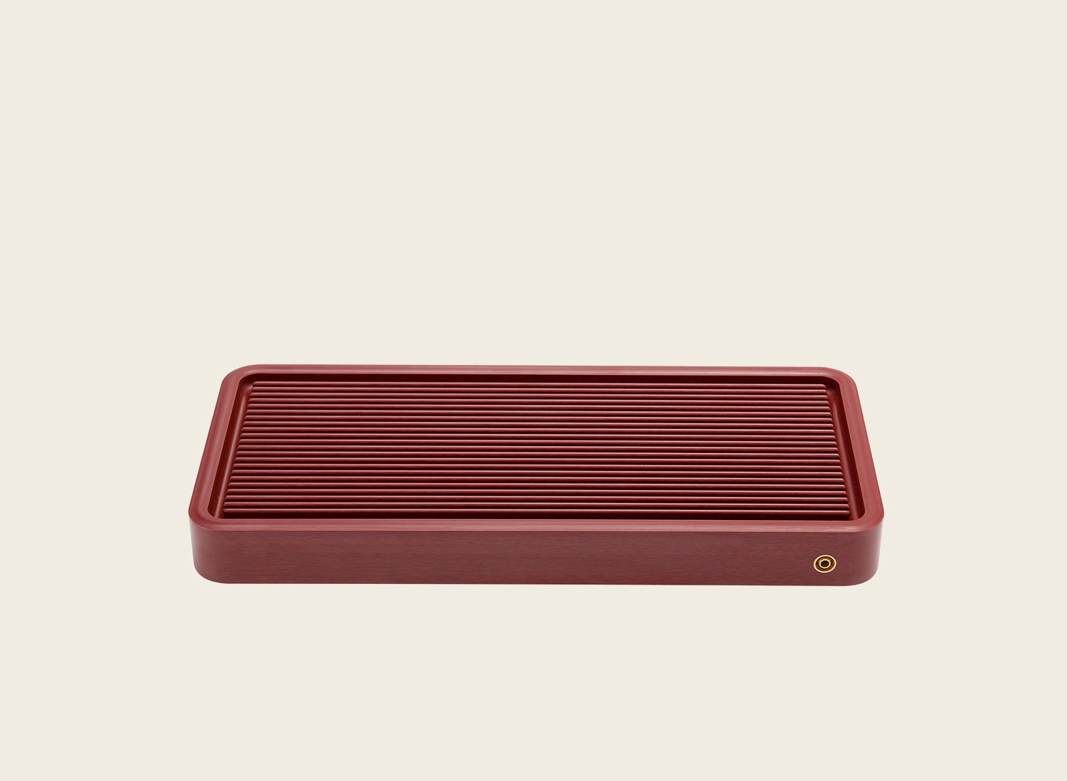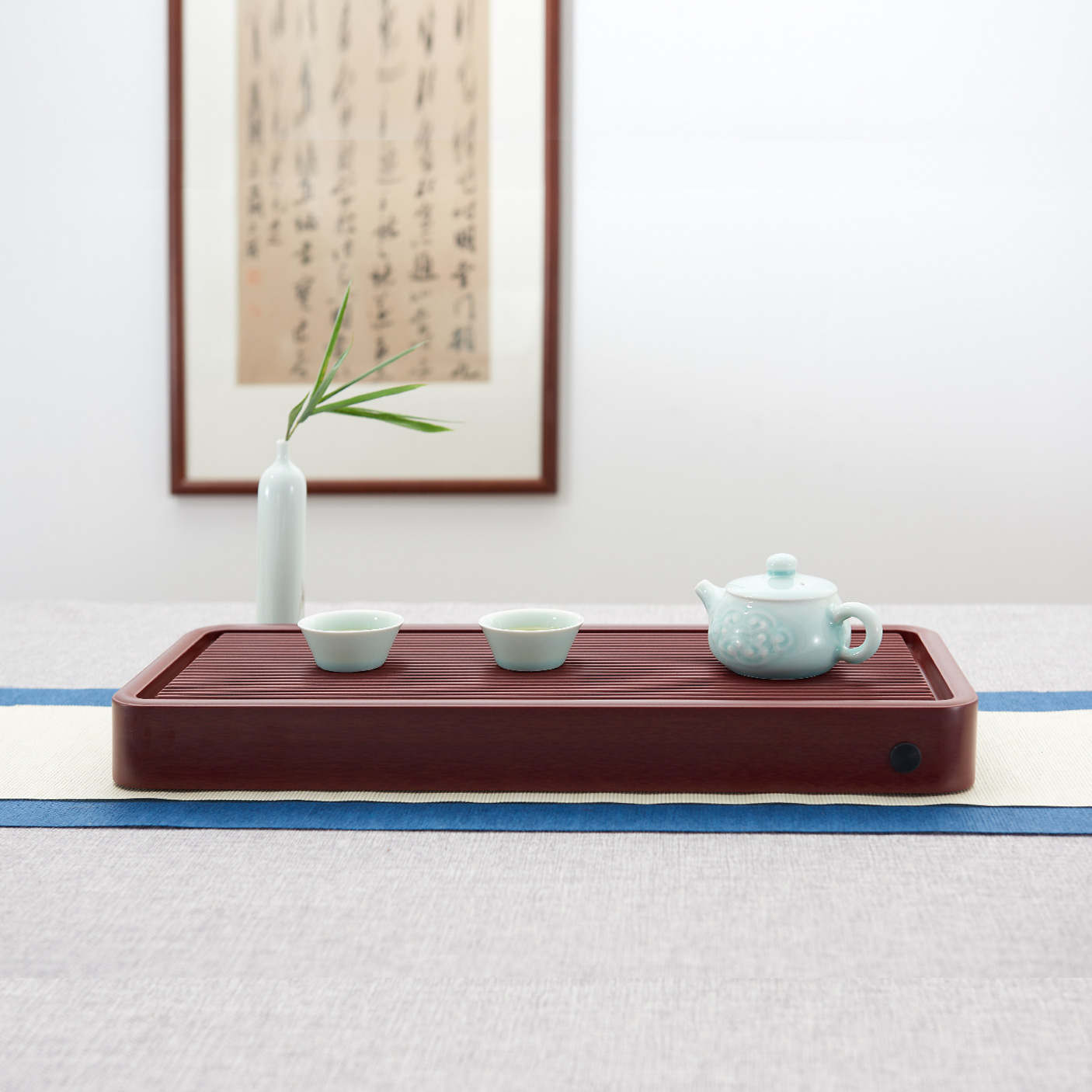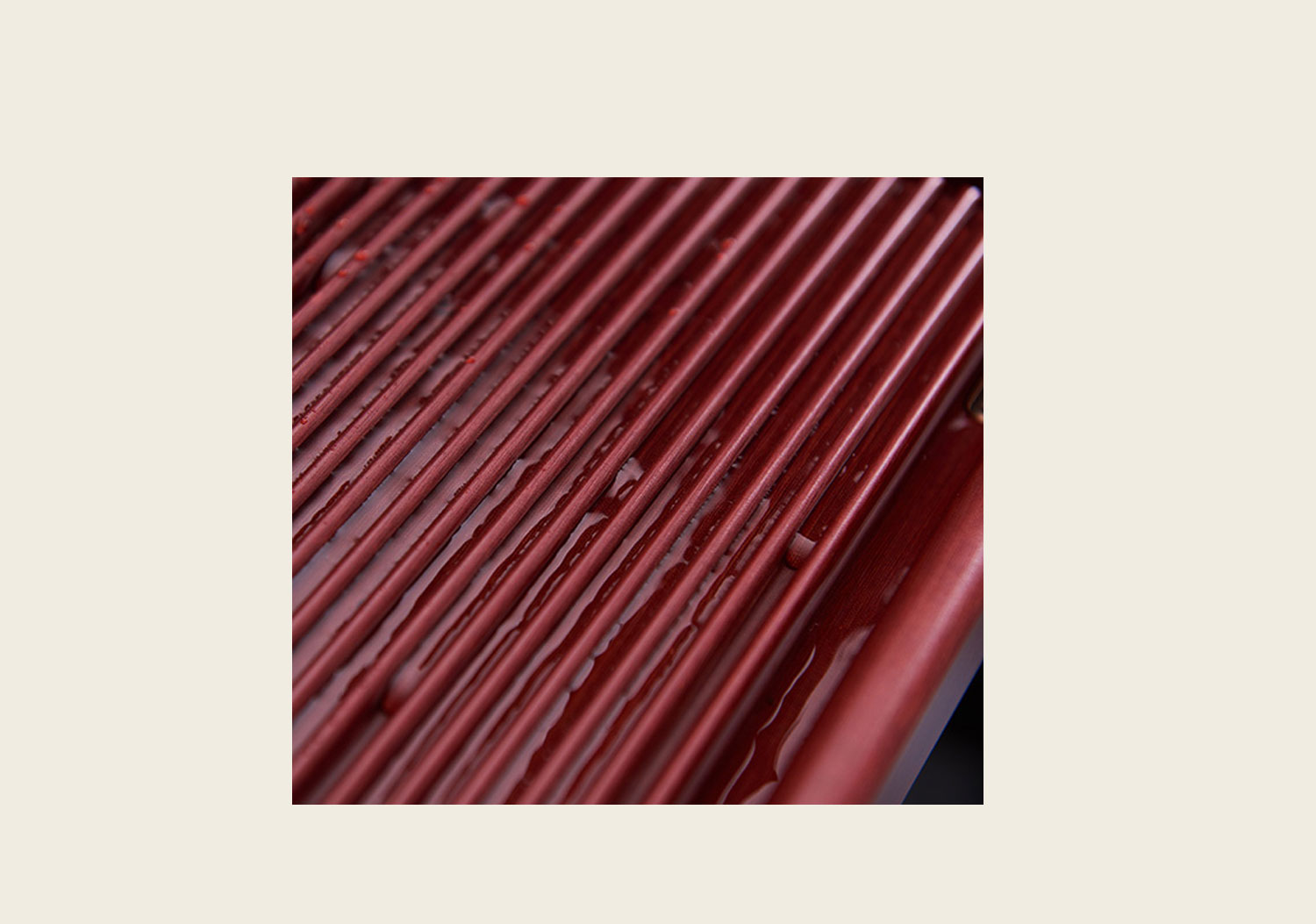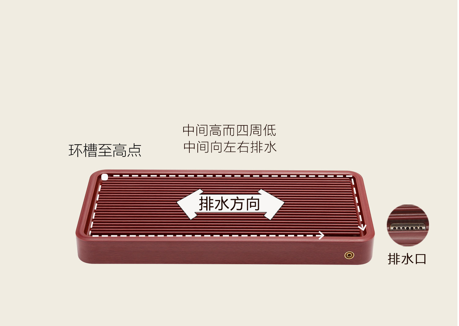 盘面整体设计有细微的高低落差,中间高而四周低、外侧环槽对角线排布至高点与低处排水口,茶汤落下后通过道道落水槽流至排水口,顺畅迅速,不积水,让茶壶底部更洁净。