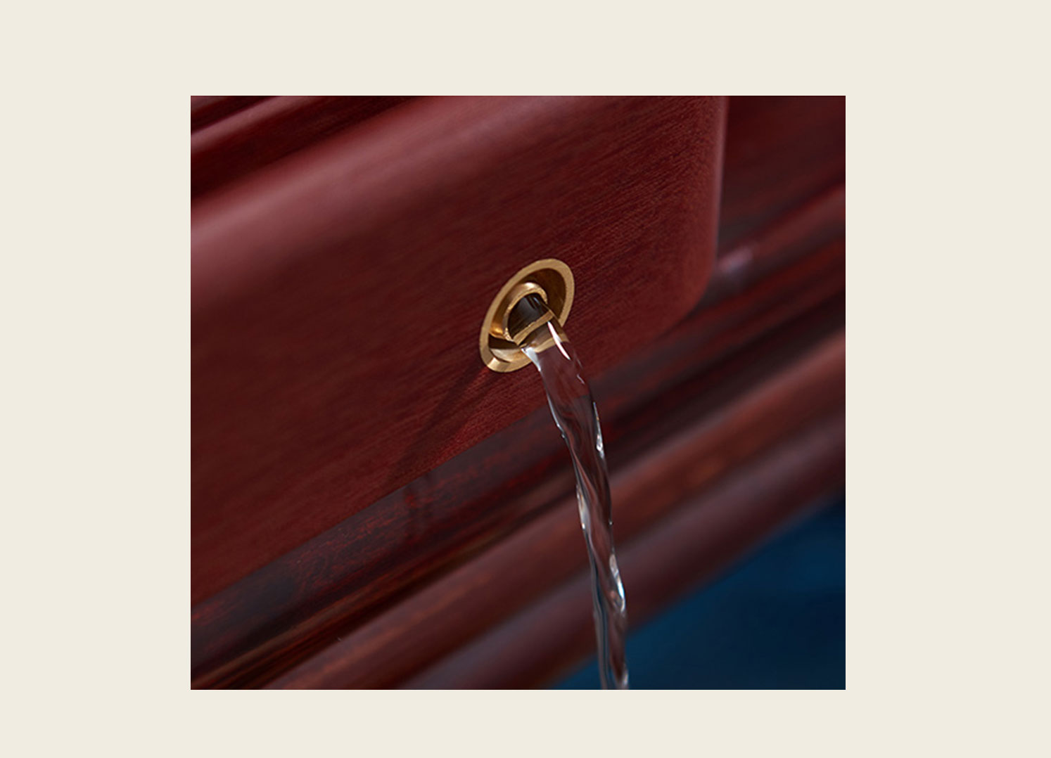 落水口、排水口设计为金属铜接口,金与木的交织如点睛一笔,分外美观精致,且材质防腐防生锈,经久耐用。