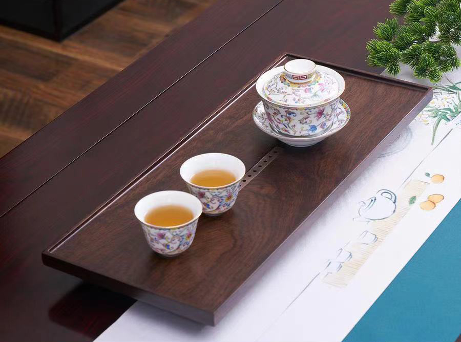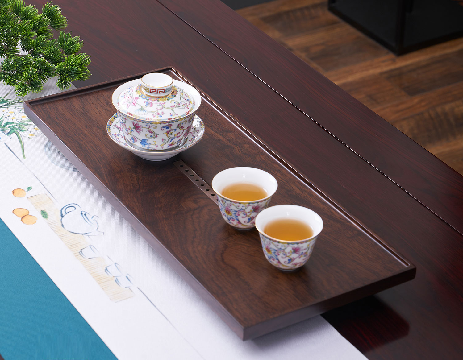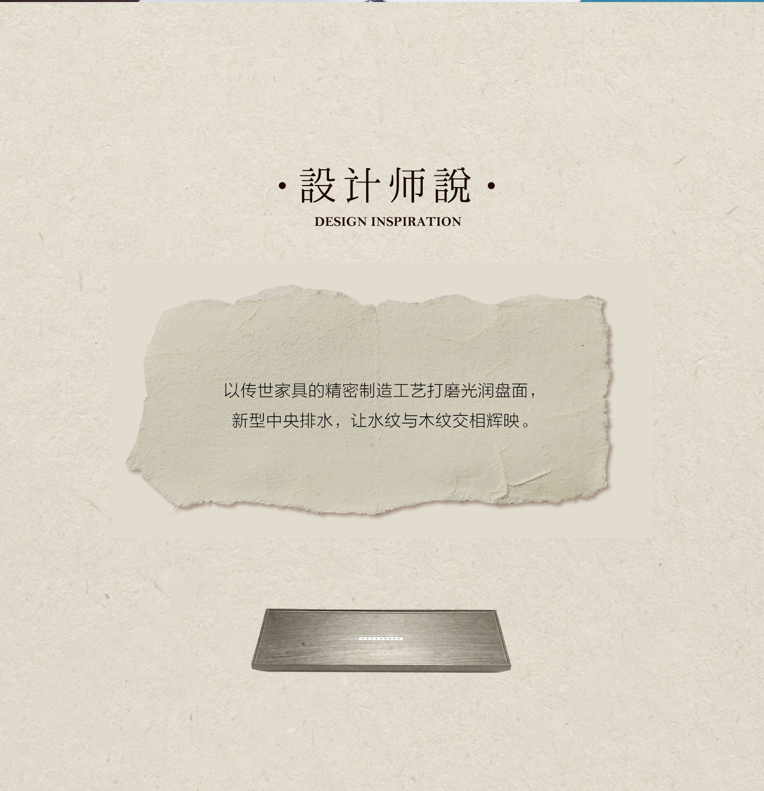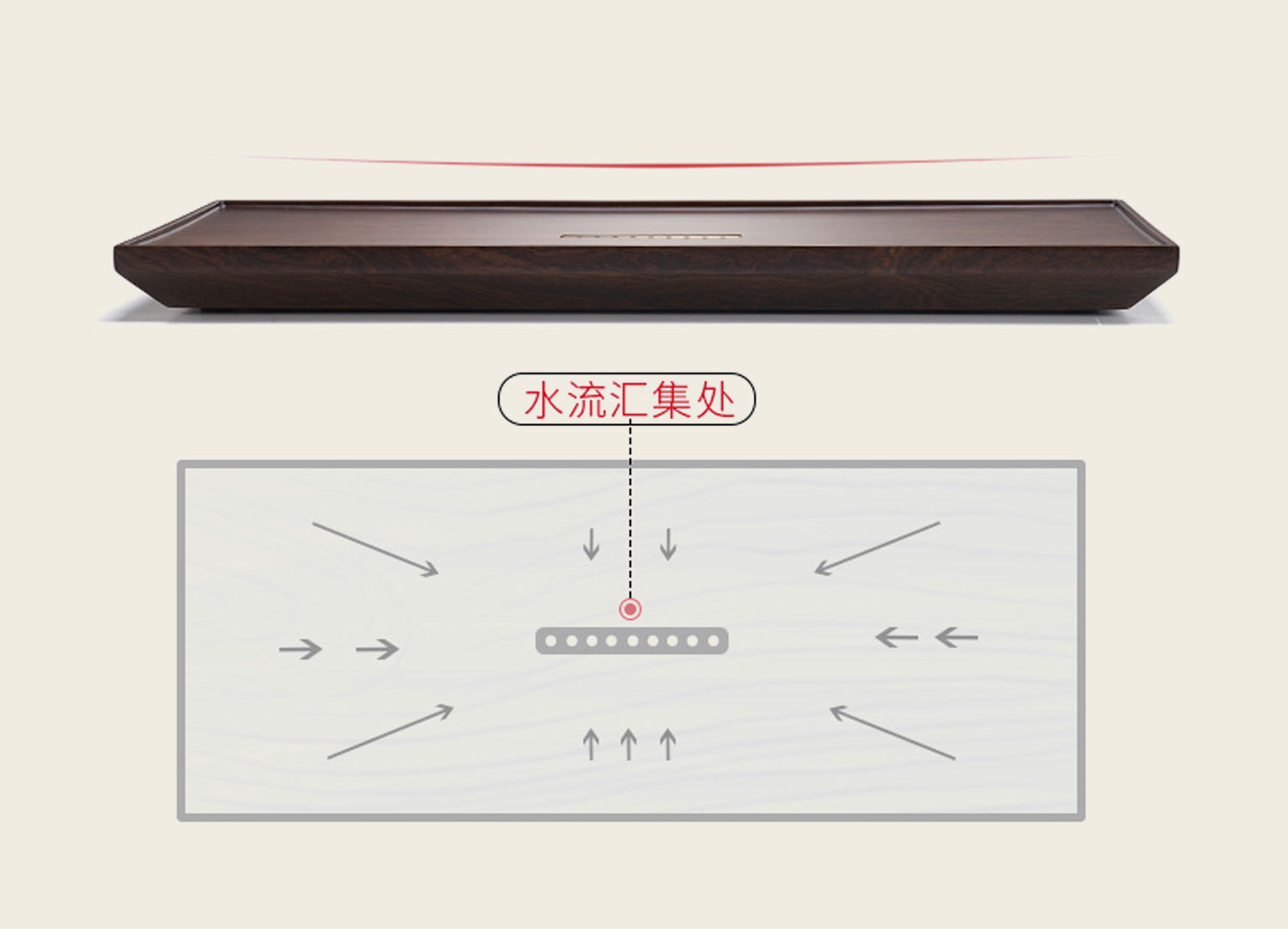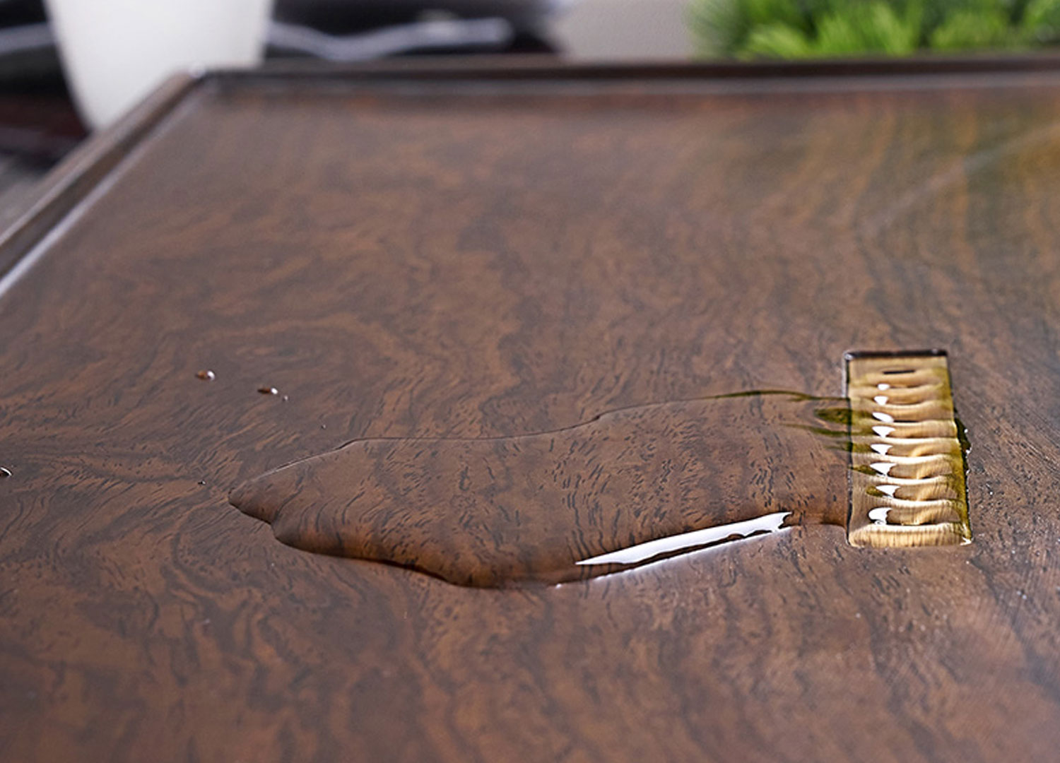 茶盘实木表面经细致打磨抛光工艺,盘面滴水即成珠滚落,进一步避免积水;边角光润细腻,触手舒适,温润如玉。