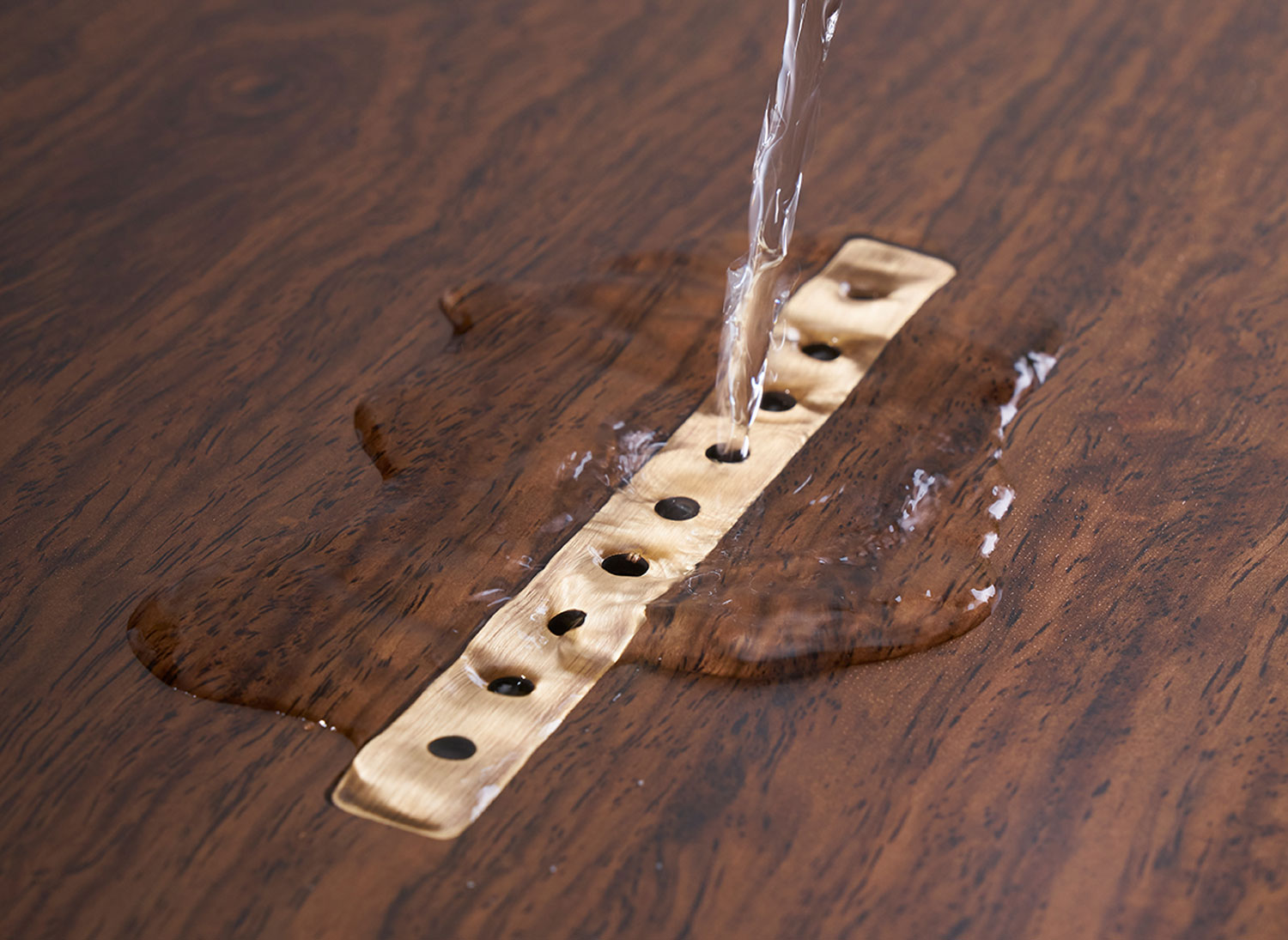 盘面排水口位于正中央,九孔如九星连珠,金光熠熠,且足够多的排水孔让盘面排水更迅速。侧面排水口则将金属铜内嵌于实木之内,可连接排水管,耐用且美观。