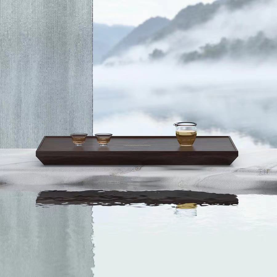 茶盘以整块实木雕刻制造,造型如一叶小舟,自盘面至底座向内收束,虽有沉甸甸的实木分量,外观却颇显轻盈。盘面实木打磨平整有光泽,木纹清晰温润,习茶待客,皆是美的享受。