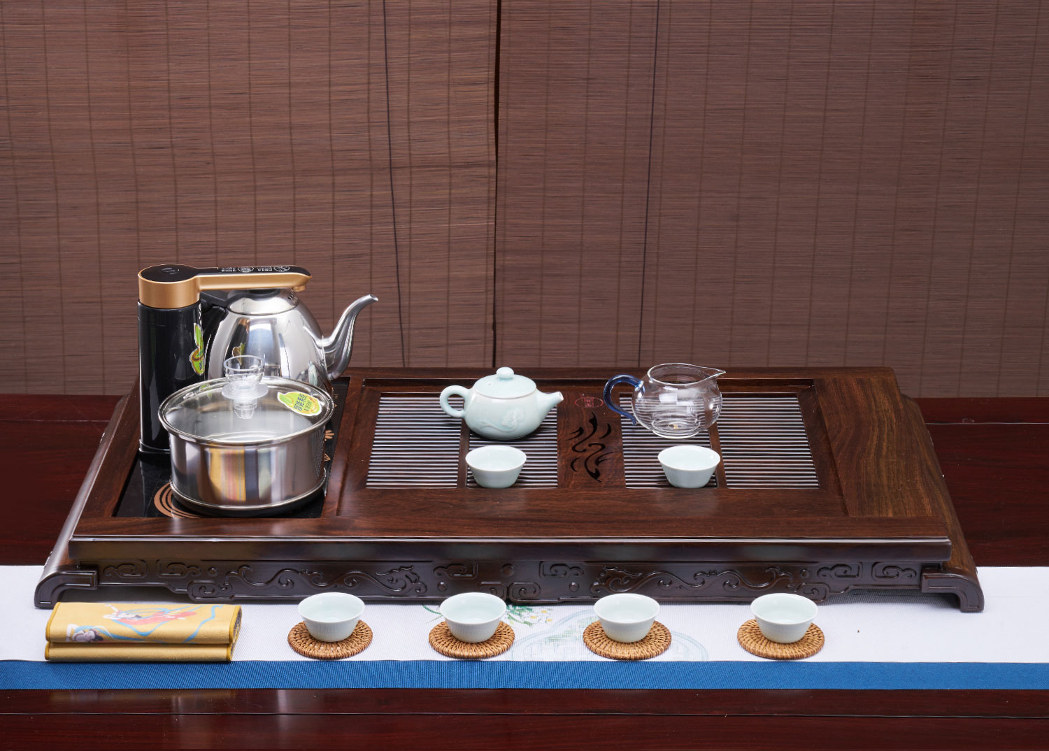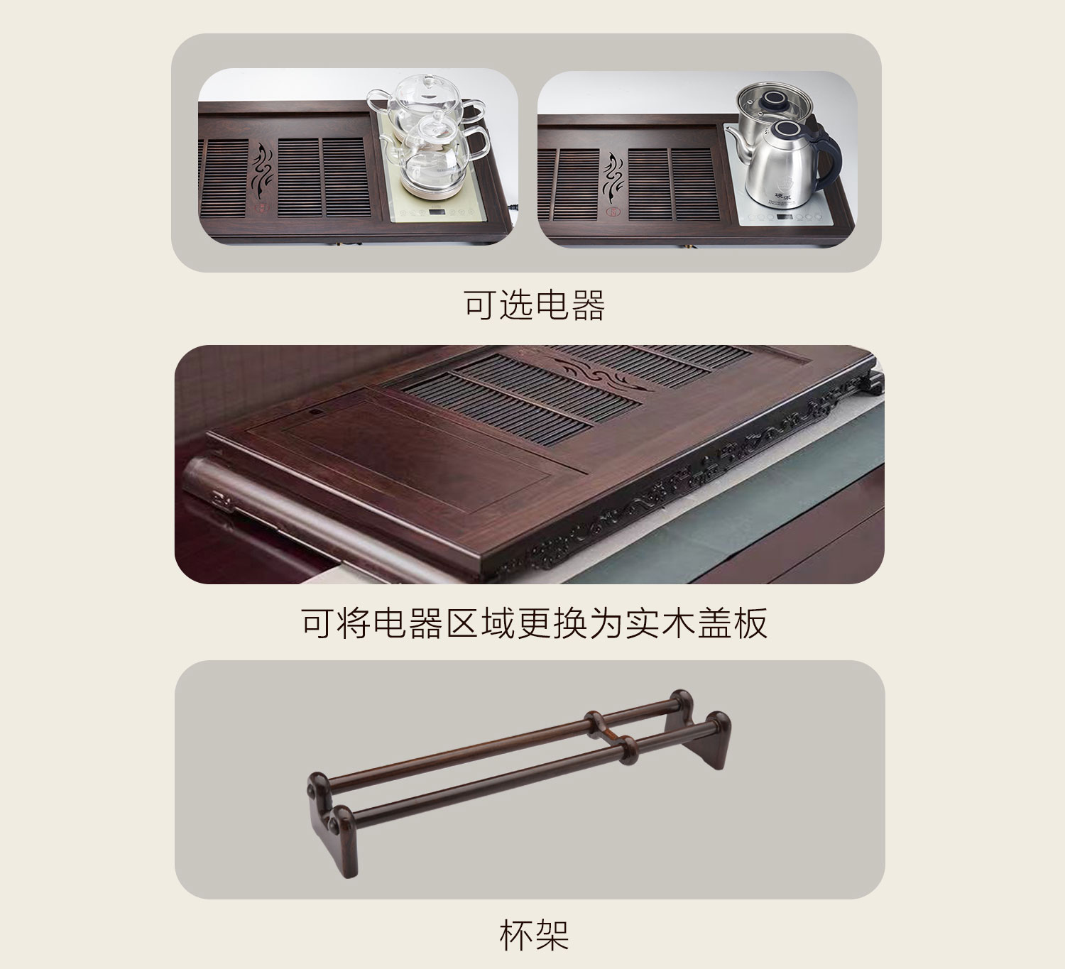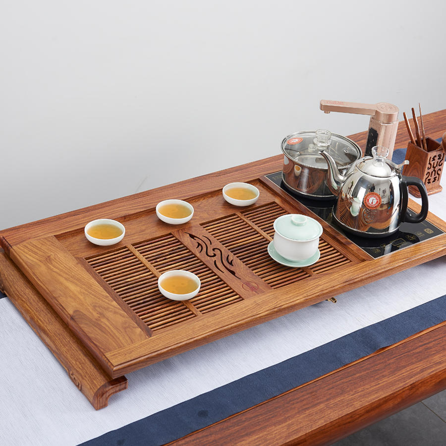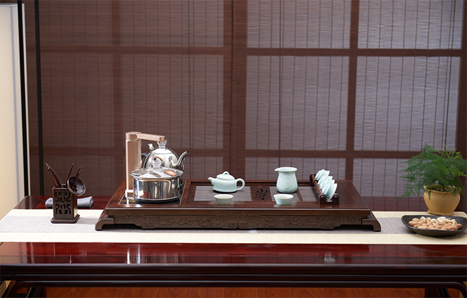可选配电器、杯架、水管等多种配件,智能煮茶炉可一键实现上水、烧水、消毒等步骤;不烧水时,也可将电器区域更换为实木盖板、增大茶盘空间。全面贴心的配套,让习茶更简单轻松。