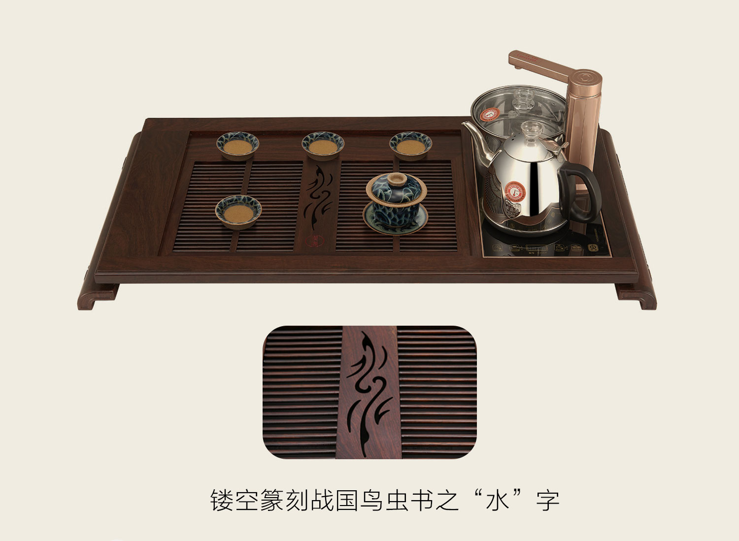 宽阔盘面可供多人饮茶,成排圆梗落水格齐整流丽,中央镂空篆刻战国鸟虫书之“水”字,字体飘逸华丽,韵味隽永深远,且使用时落水流畅利落,水不会积聚在盘面,更清爽便捷。