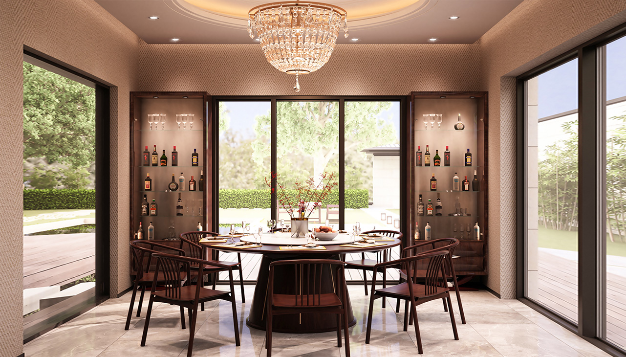 从中秋佳节玉盘般的皓月中汲取灵感,选择洁白岩板为桌面,打造石、木双材料圆桌。桌如满月,敬人间圆满。