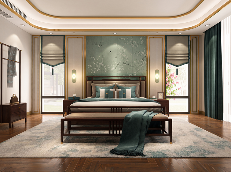 整套家具全实木制造,榫卯工艺接合,保留中式家具优雅温润的审美理念,并将其简化为更具现代感的线条表达,搭配符合当代需求的软包,打造唯美而舒适的寝卧栖居。