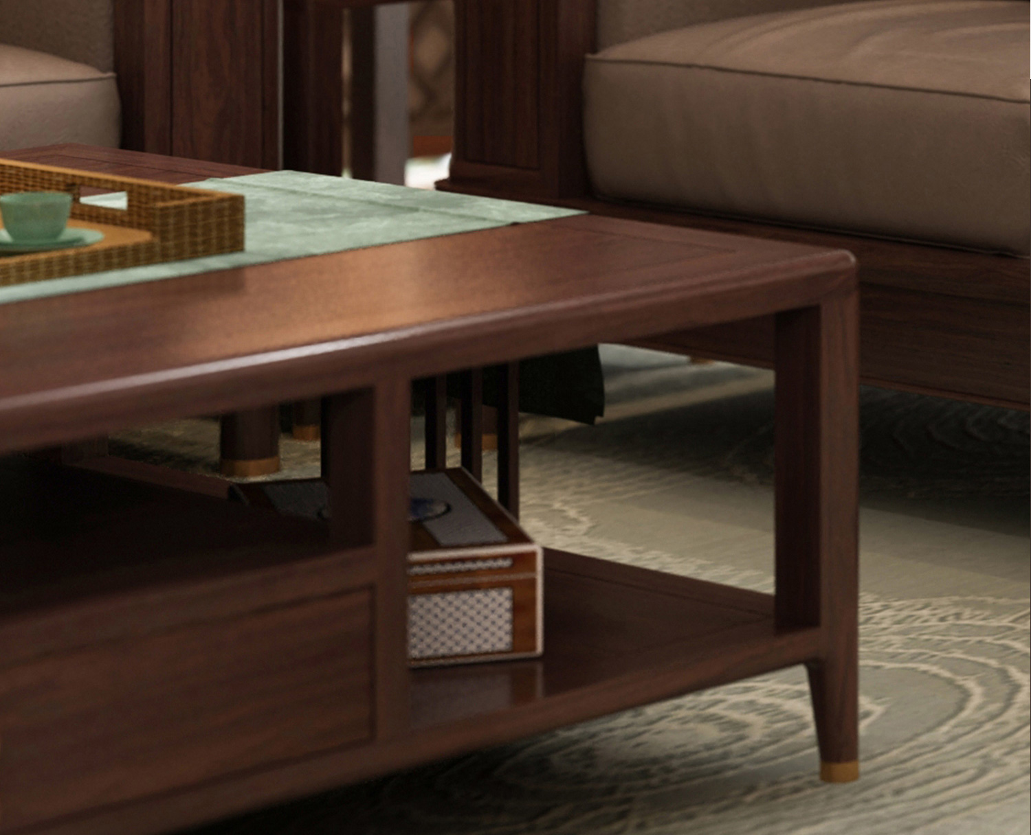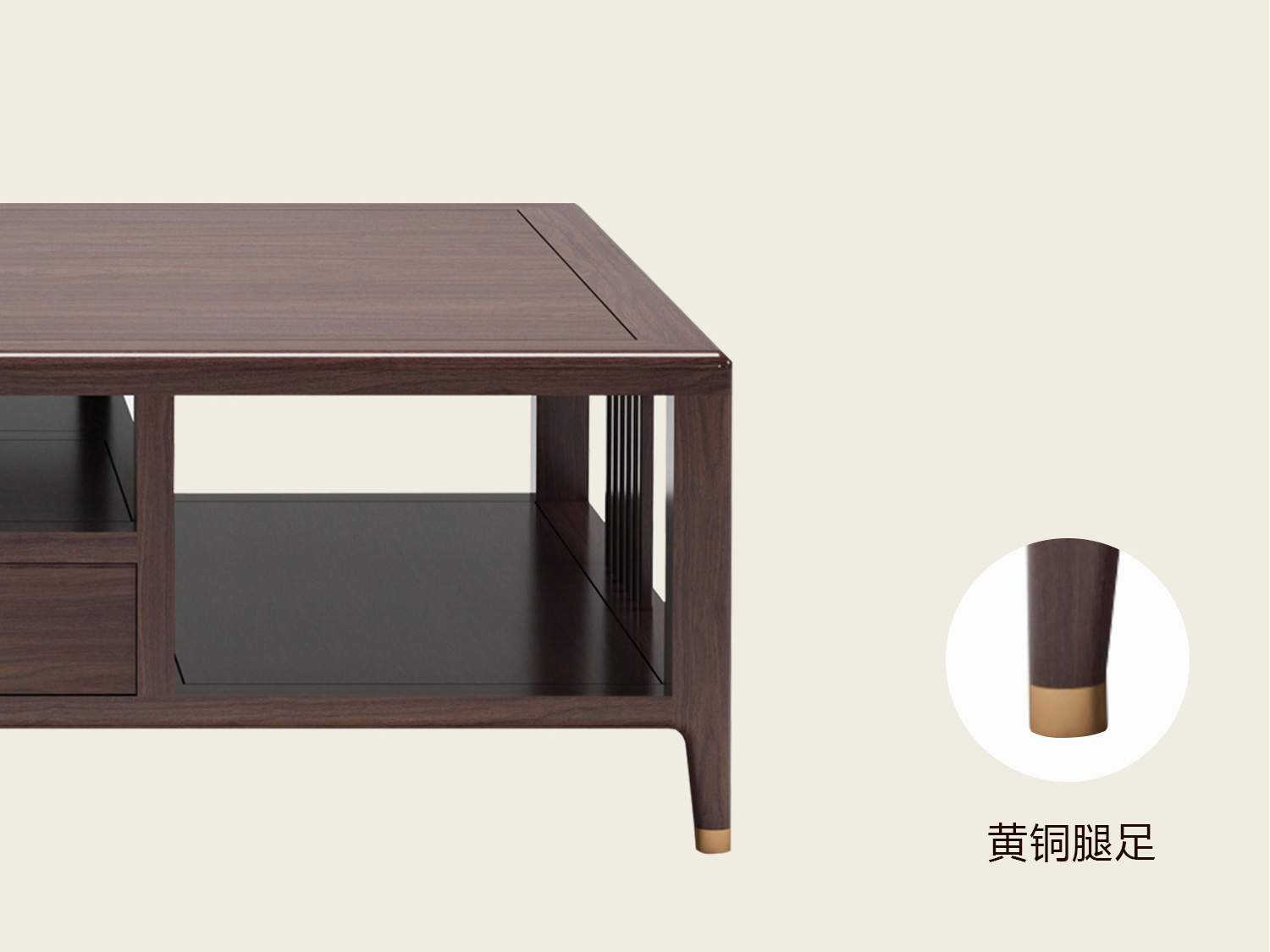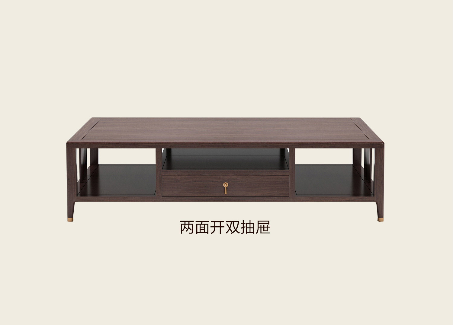 中设两个抽屉,分别在茶几的前、后两面打开。结合几面、底面与抽屉之间的隔板,提供充裕的储物、置物空间,实用又便捷。