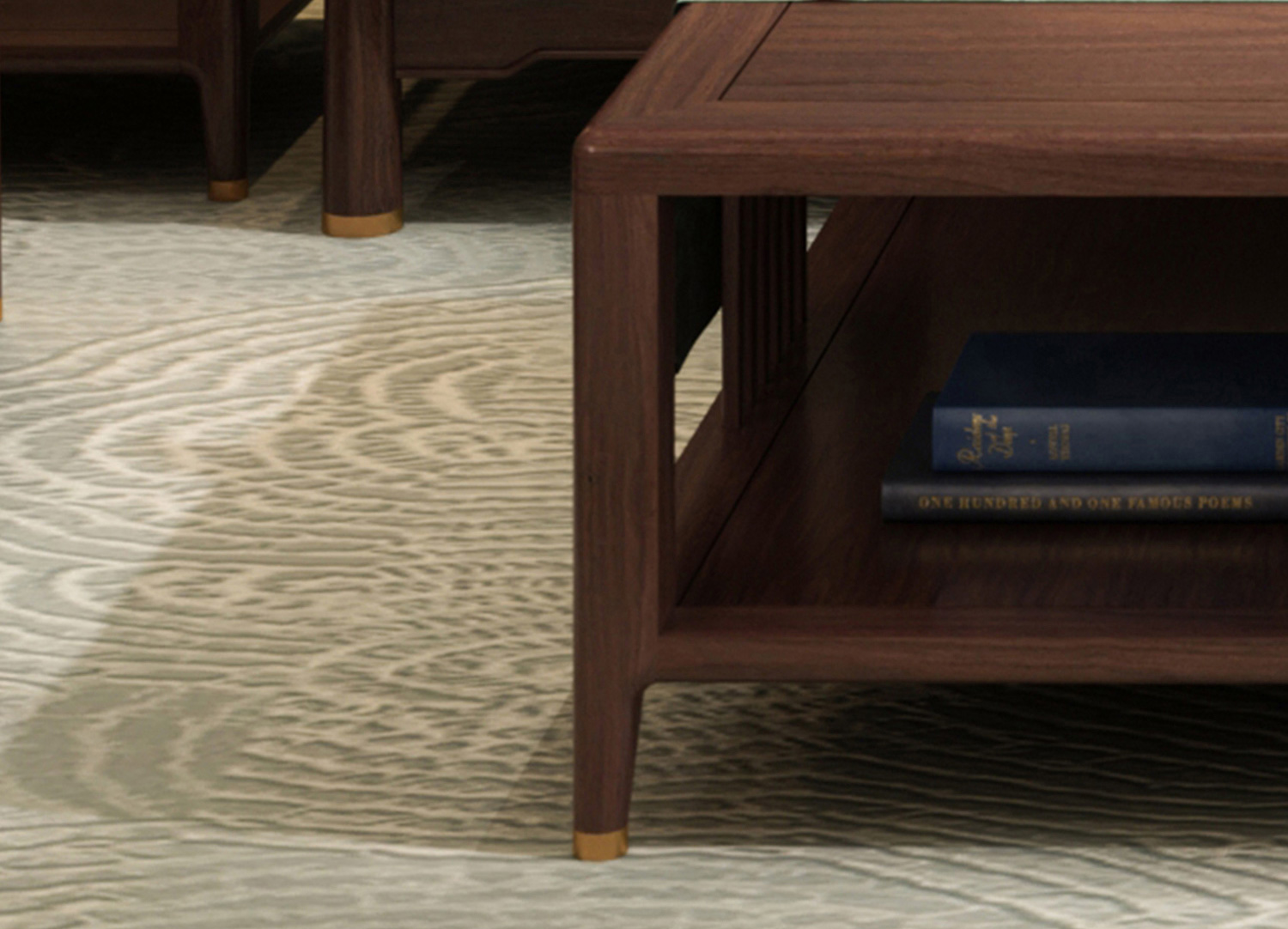茶几侧面饰以五道笔直流丽的格栅,清丽别致,也让整体气质更显通透空灵,虽宽大稳重,却不显笨重。