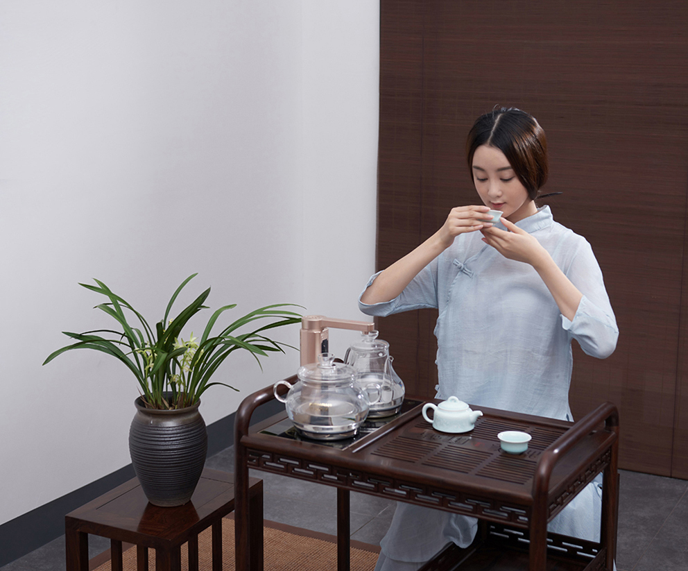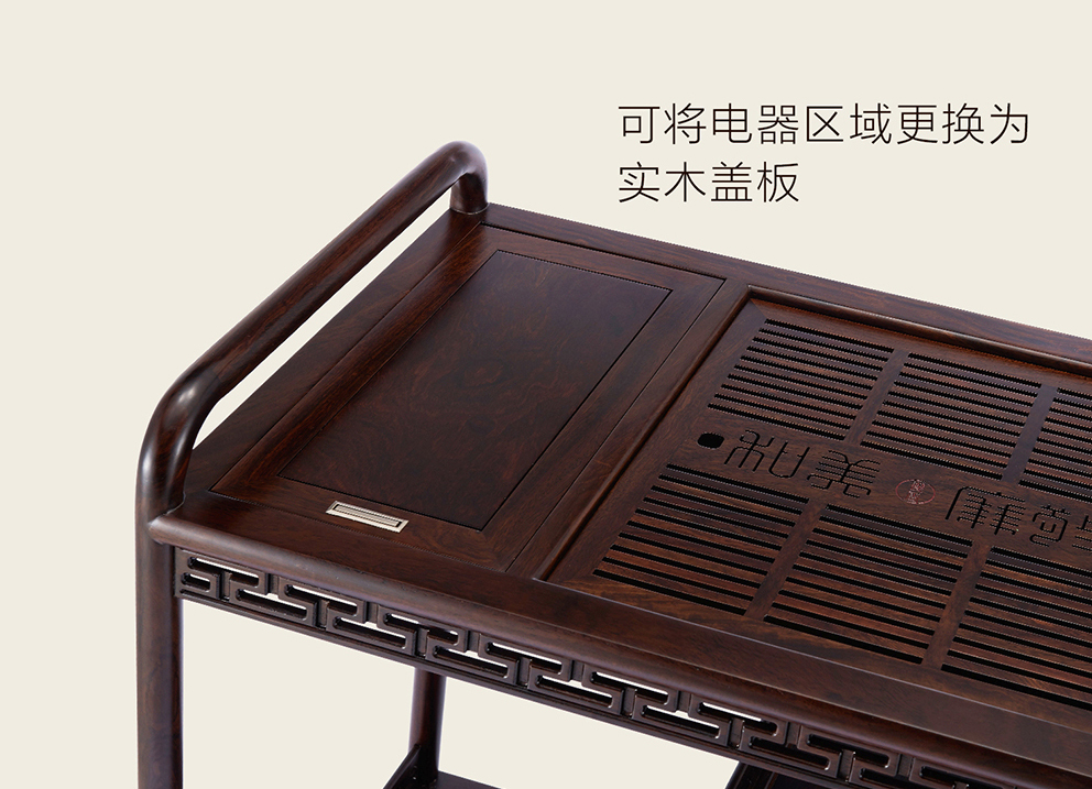 可选配电器、水管等多种配件,智能煮茶炉可一键实现上水、烧水、消毒等步骤;不烧水时,也可将电器区域更换为实木盖板、增大茶盘空间。全面贴心的配套,让习茶更简单轻松。
