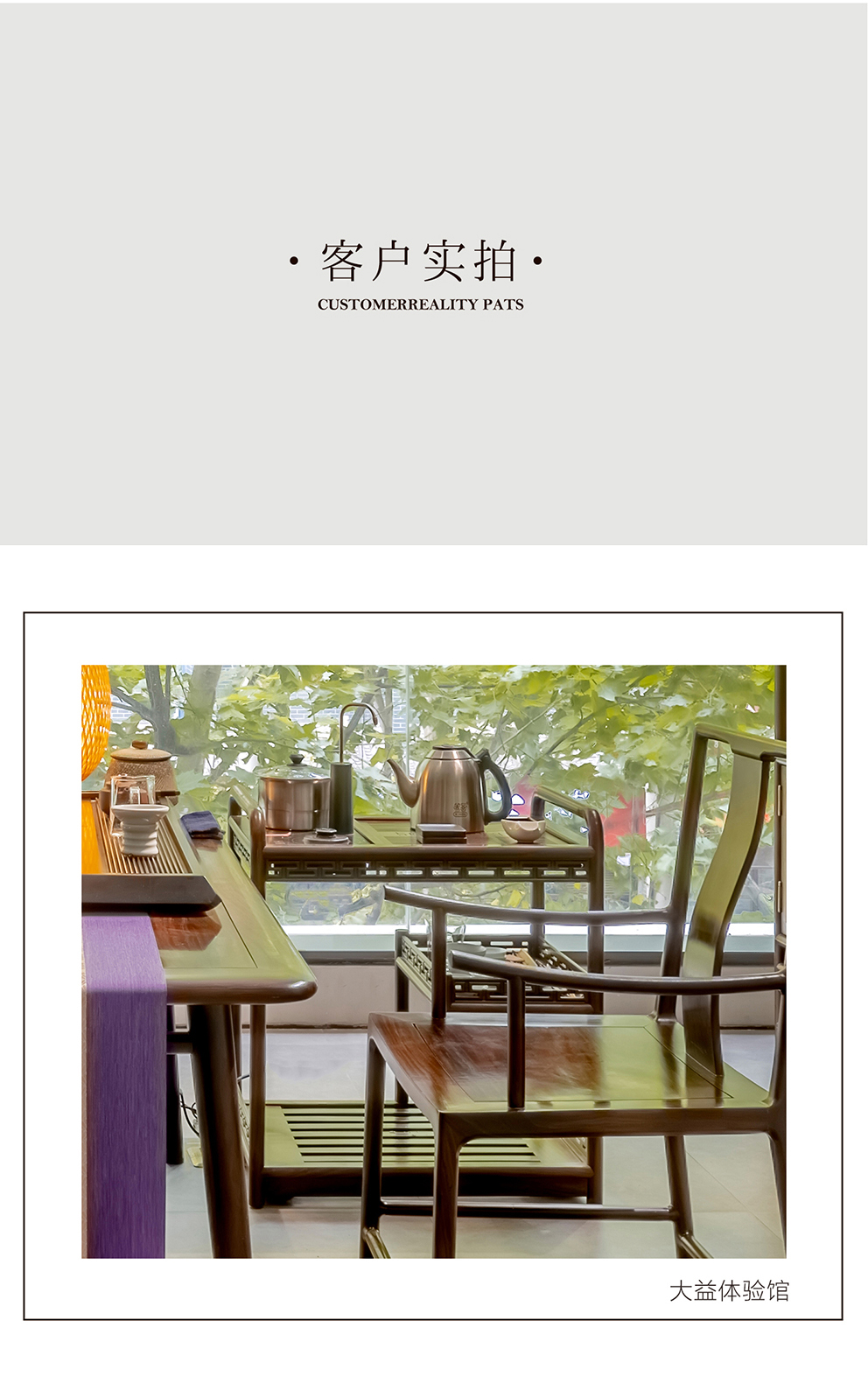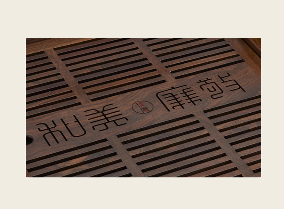 湿泡台采用经典的网格落水方式,齐整落水格中饰有中华茶德“和美廉敬”;牙条、护栏装饰有古典纹饰,回环往复,韵味无穷。