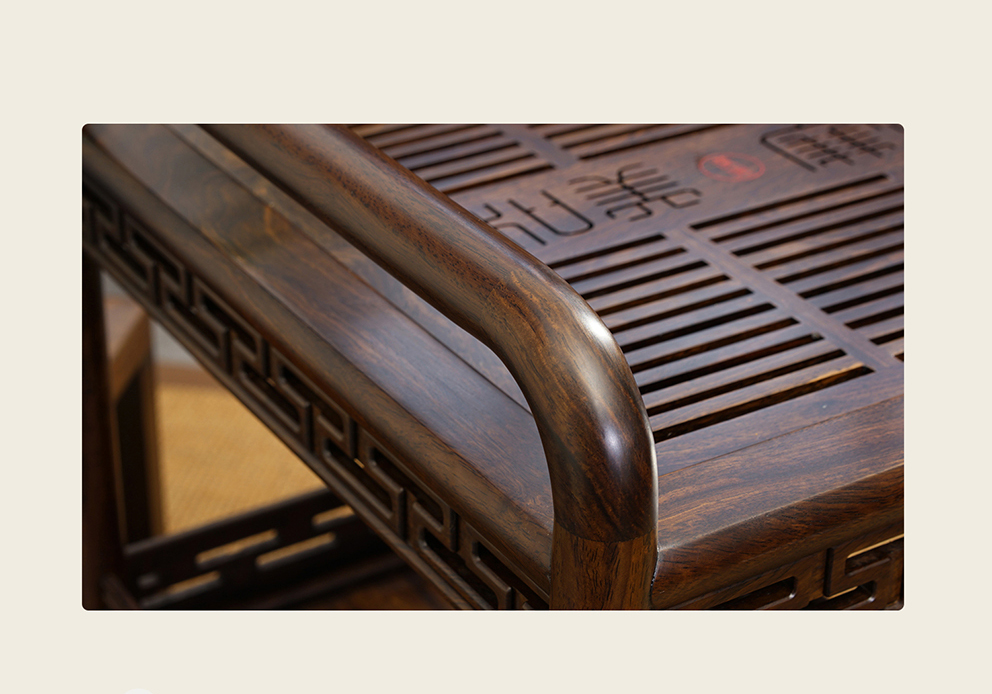 纯手工交替进行刮磨、擦漆工艺,砂纸目数逐级提升,配合环保木器漆,赋予家具光滑温润的如玉质感。