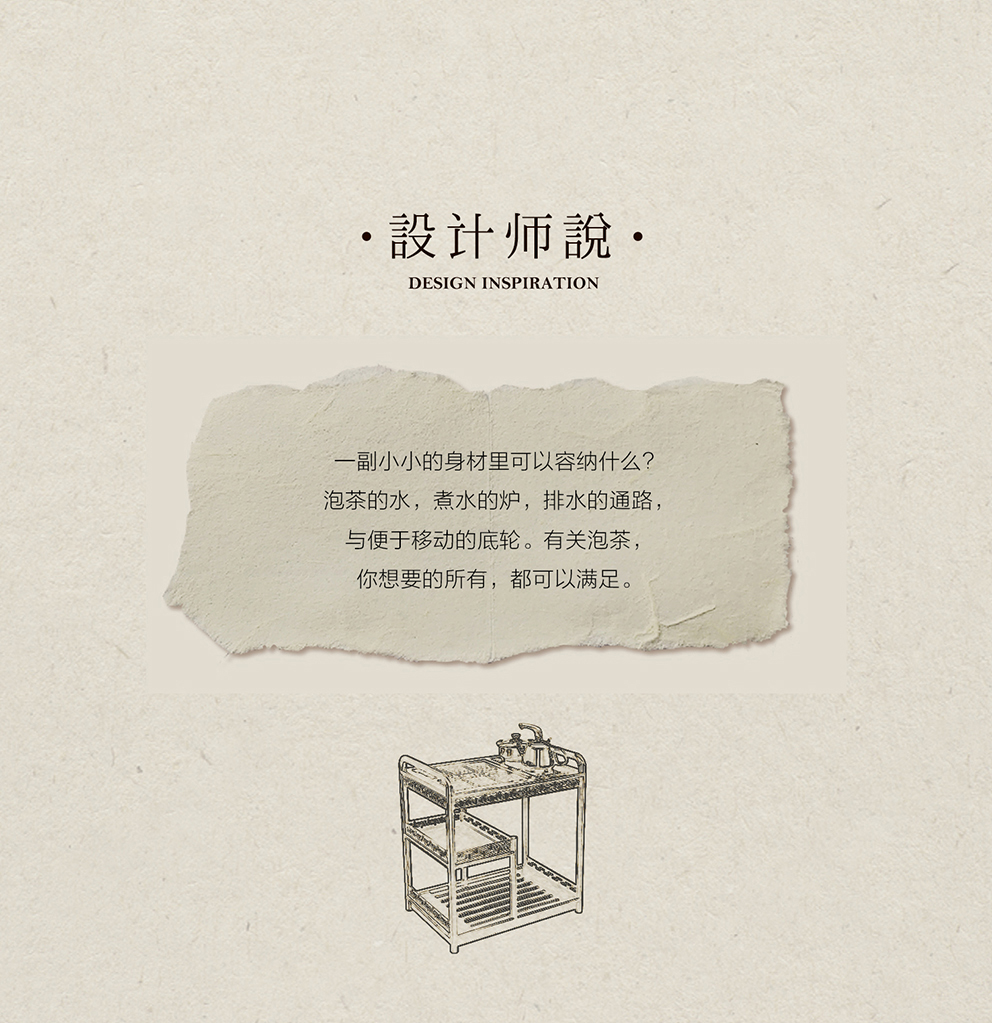 简约方形结构,顶部面板为湿泡台与电茶炉,湿泡台下设储水盘。中层可摆放零碎器皿,下层空间足够置放17L容量矿泉水桶及废水桶,合理分配的空间让功能更全面。