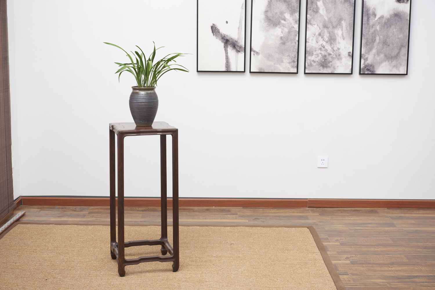古典花几设计风格典雅柔美,腿足的四个立面微妙内凹,似直实曲。底部则由四根管脚枨相连,枨子中段向内扣入,曲直相接形成波纹感,搭配内翻马蹄足,曲直相接、刚柔并济,正如花草与实木的相遇。