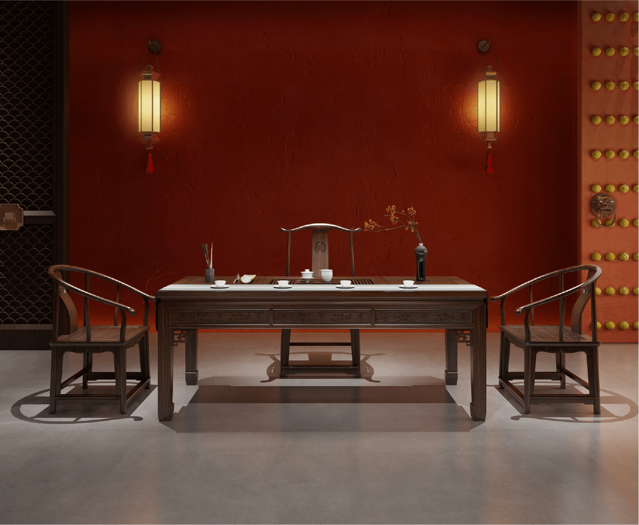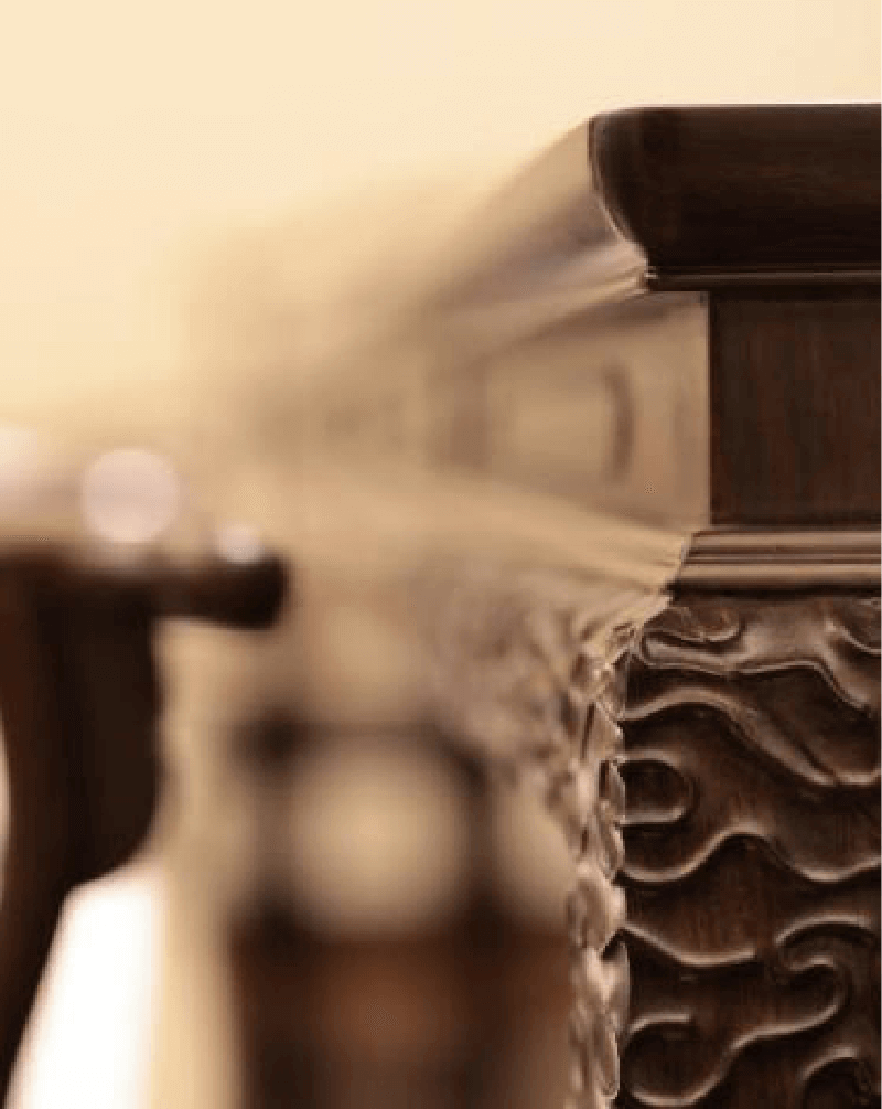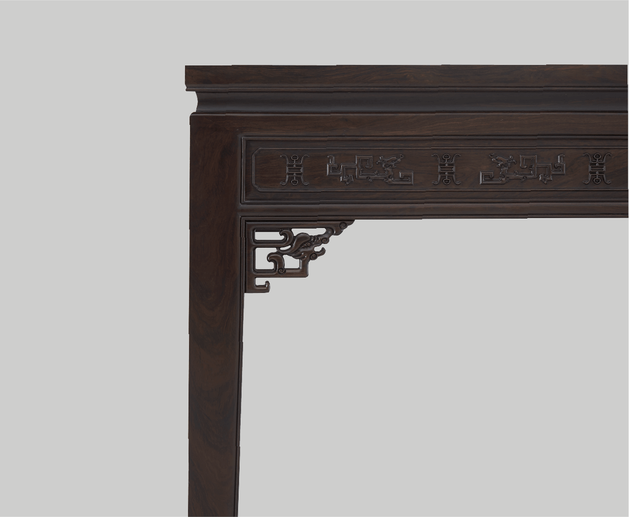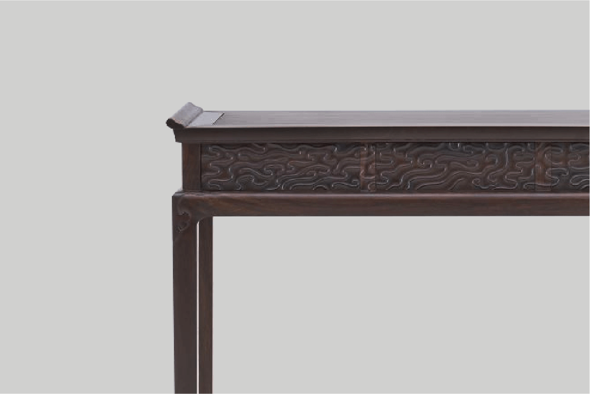 形| 古典系列的源头,来自中国古典时代庄严与秩序之美,蕴藏着属于上古礼器、世族官邸般的的堂堂气象。设计上,中正浑厚的造型结构、飞扬流动的纹饰语言,金石质地的玄黑之色木材,细腻兼有力量的雕刻,无一不令人感知其磅礴而出的“气势”。也正因如此,相对韵系列的婉约气质,形系列更多展现中国家具的仪式美感,若非大空间、大格局,不足以容纳其“气势”。