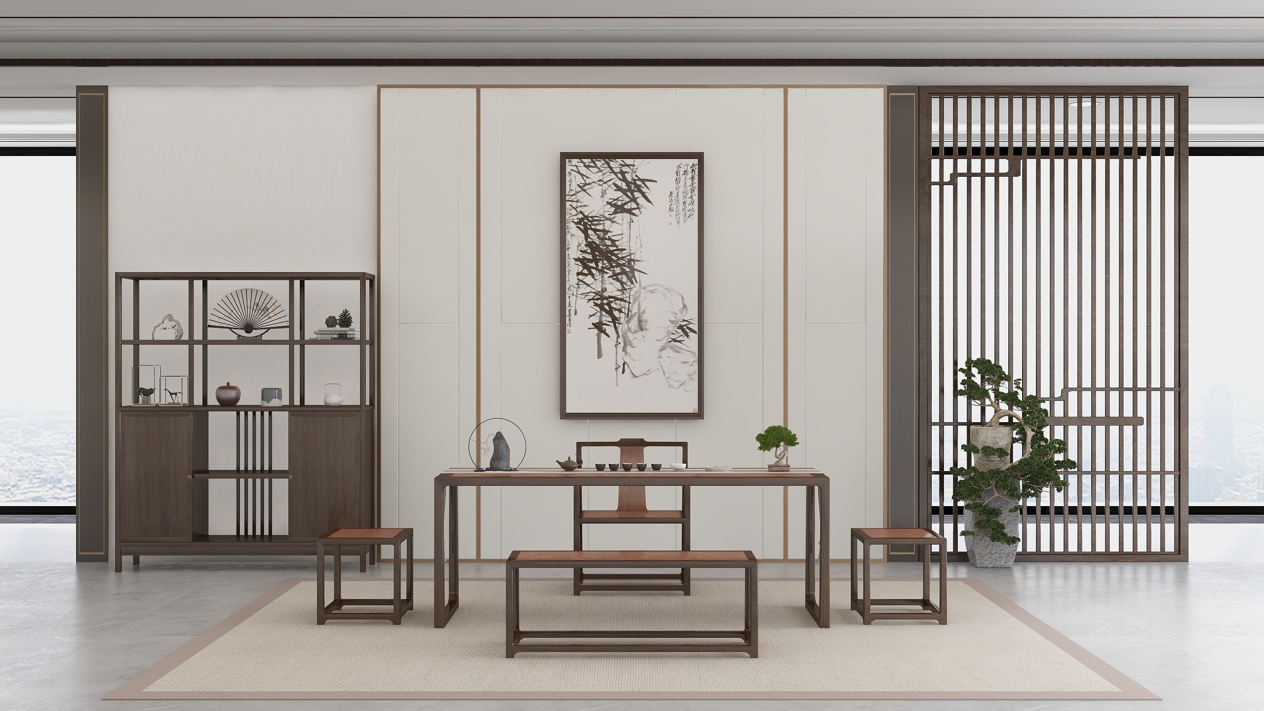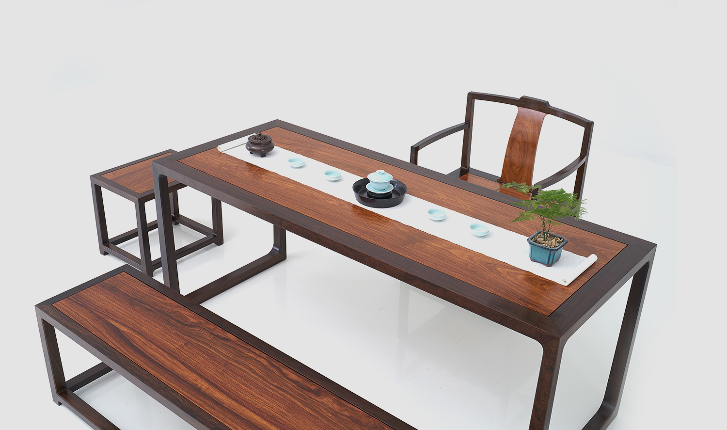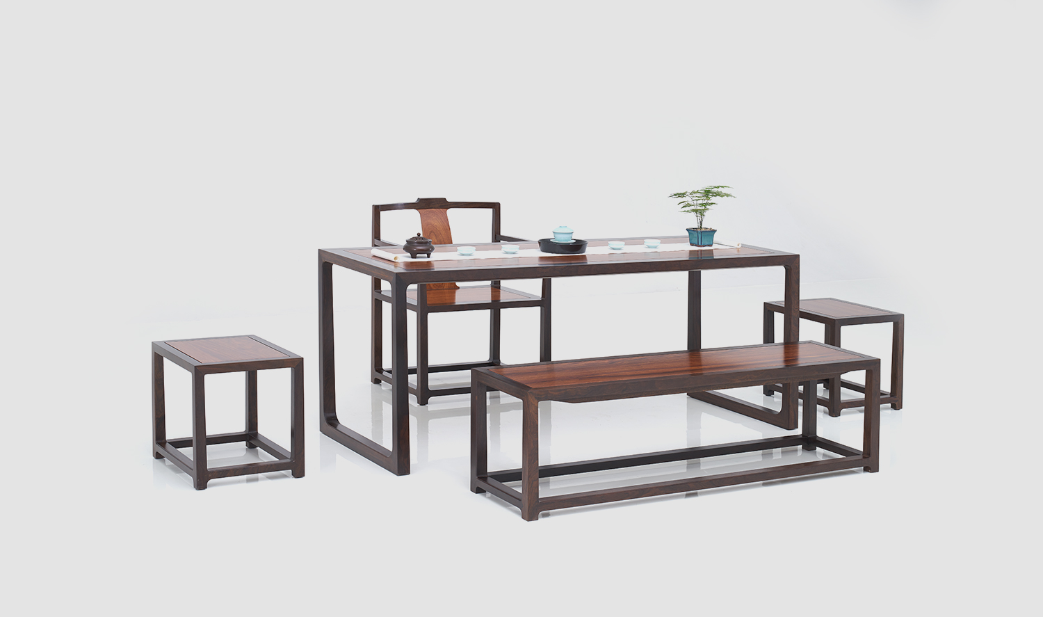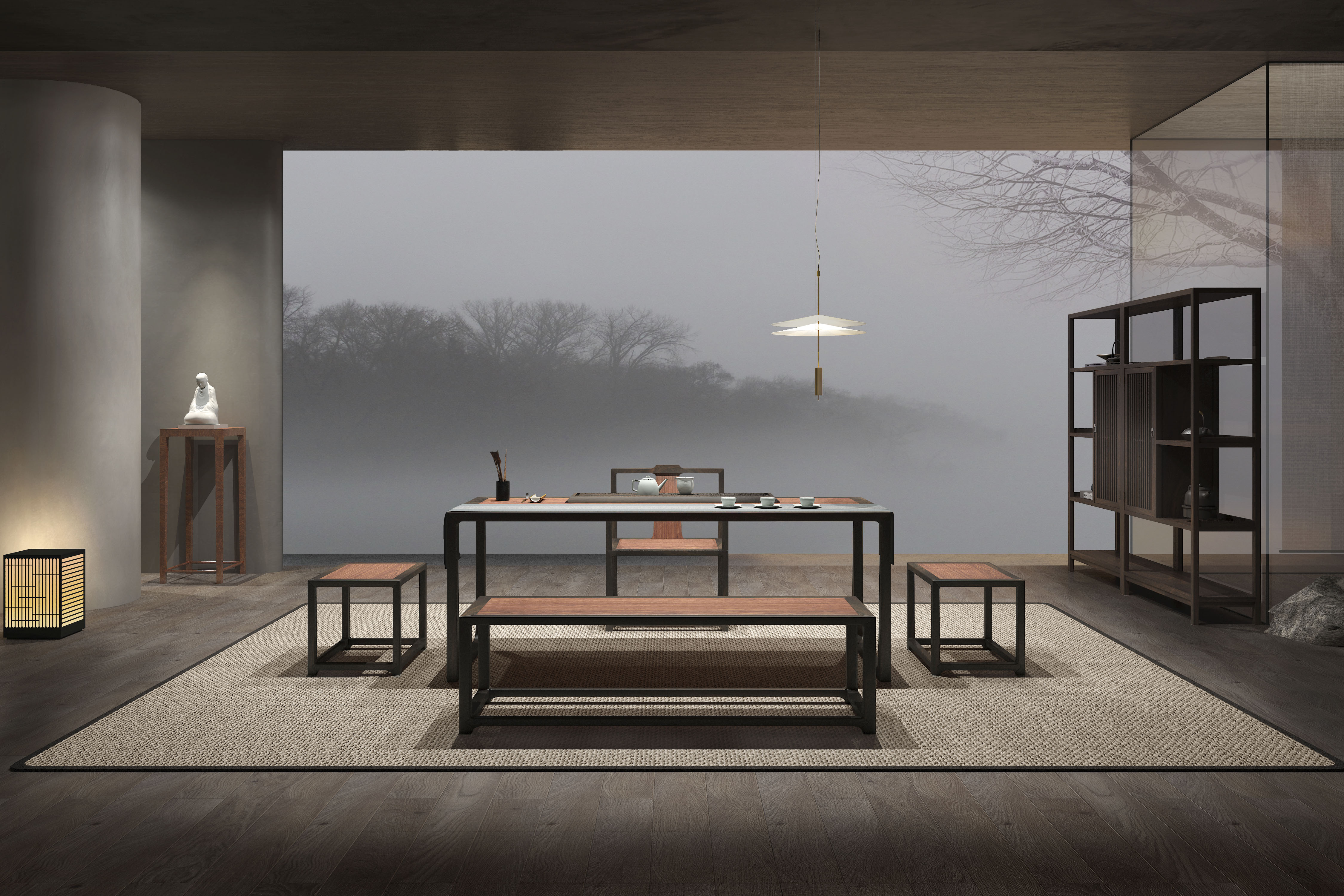 少见的桌椅加条凳组合方式的套组空间,改变了以往茶桌套组分席而座的形式,使摆放空间的氛围变得轻松、亲切,拉近人与人之间的距离。