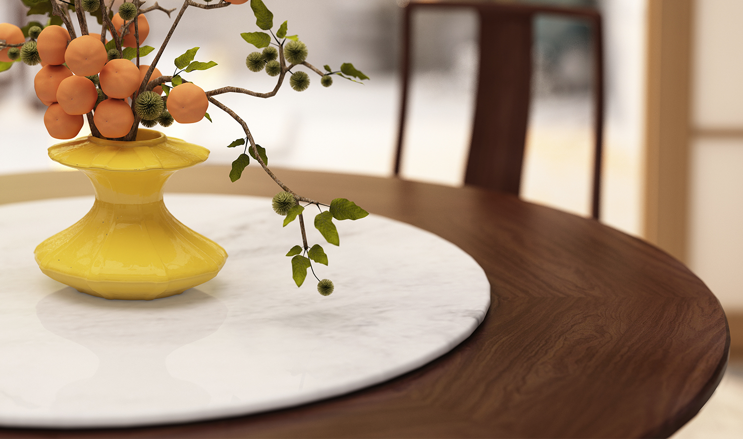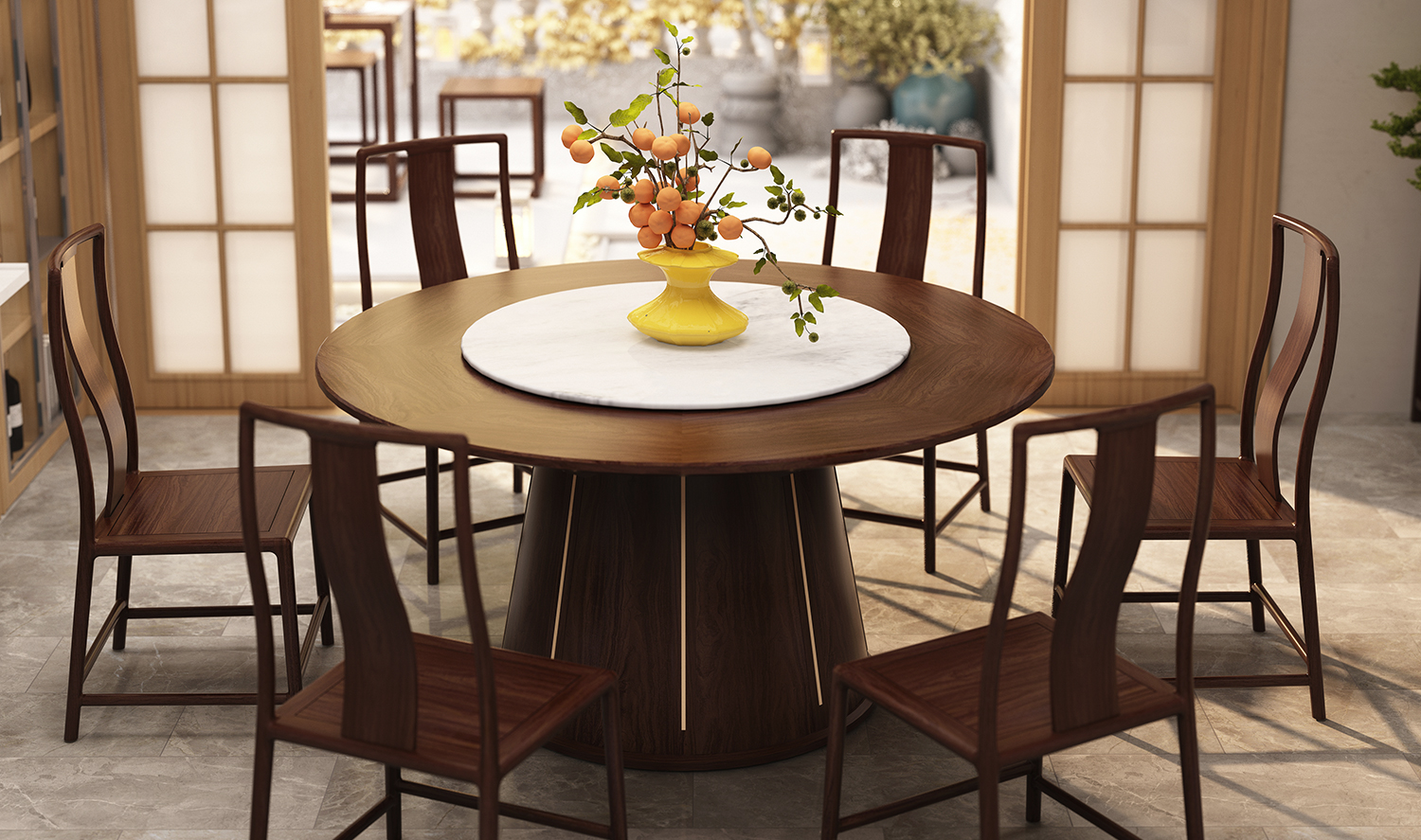 实木桌体、大理石转盘双材搭配,深色硬木与浅色岩板的典雅相遇,天然木纹、石纹变幻如水波云雾,提升空间格调。