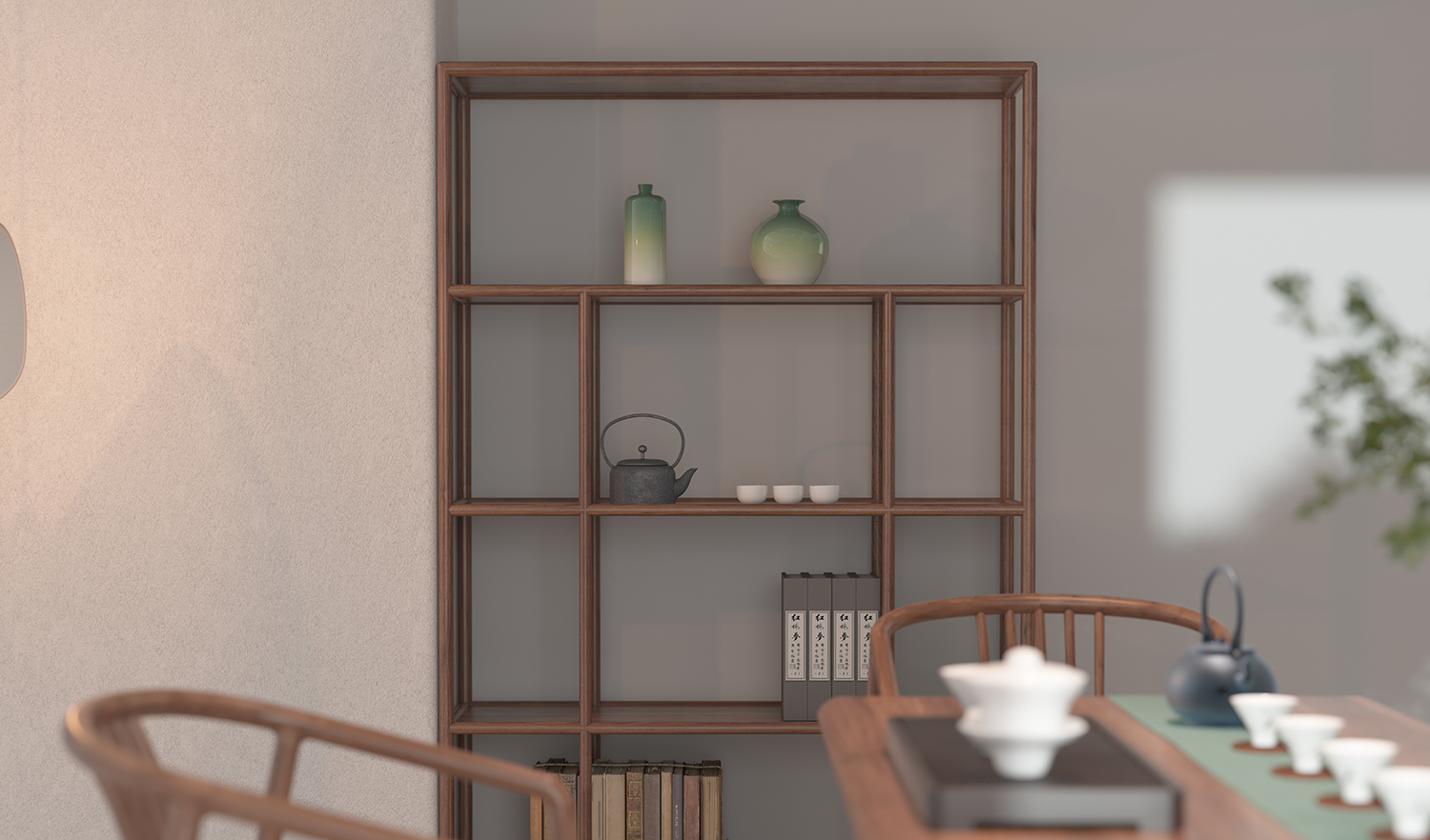 配套柜格为黑胡桃的「澄怀」,博古架呈对称格局,四面敞开,去形凝骨,板面光素。以圆材对空间进行利落分割,其余所有装饰尽数舍去,大面积留白,简到极致,便生出了高雅。
