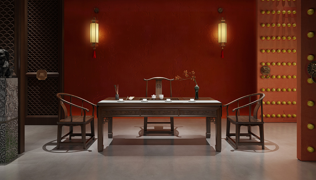 主椅选用标准的四出头官帽椅,造型源自古代官员冠帽,扶手、搭脑四角飞出,又如建筑飞檐,形态高大舒展,线条飘逸优美。靠背亦有祥龙盘踞,呼应主桌。