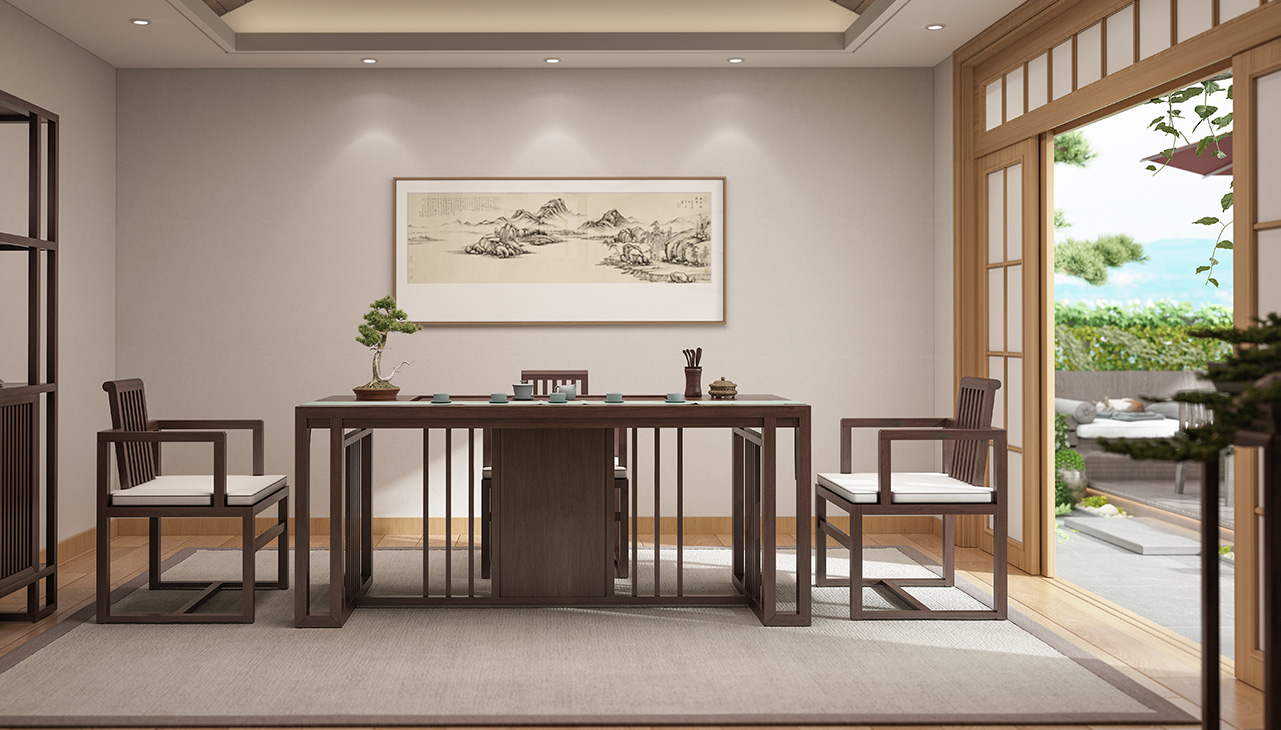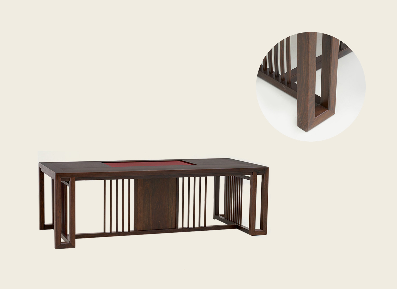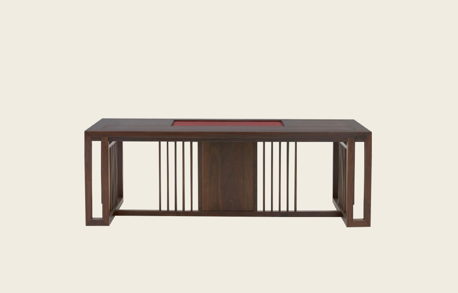 时尚典雅的新中式设计风格,桌体虽宽大,却不显沉闷。阅庭系列标志性的双框腿修长笔挺地立于两侧,稳重而不失灵动。