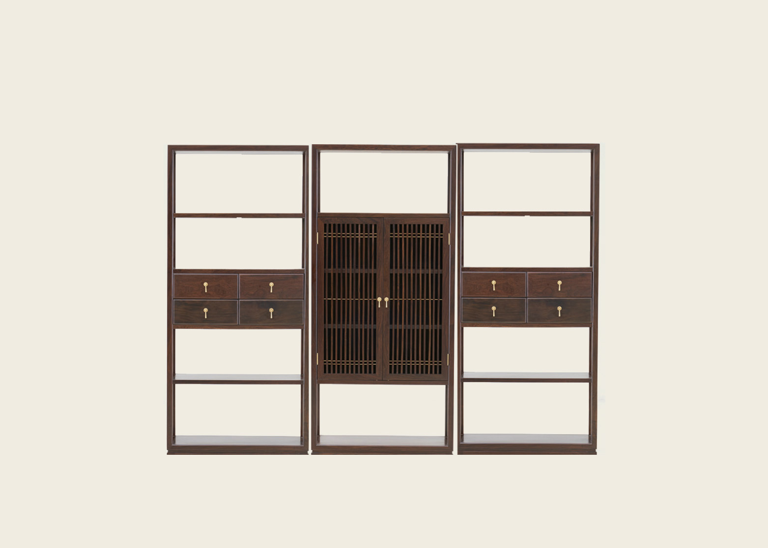 配套观澜博古架,A、B两种款型,示范为ABA模式组搭,重心居中端庄,轮廓高挑优雅,格栅对开门中以铜条穿插,金属的光泽在格栅中时隐时现,与铜拉手相应成趣。