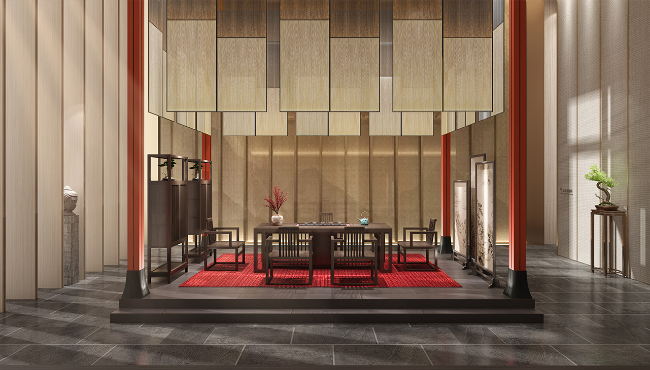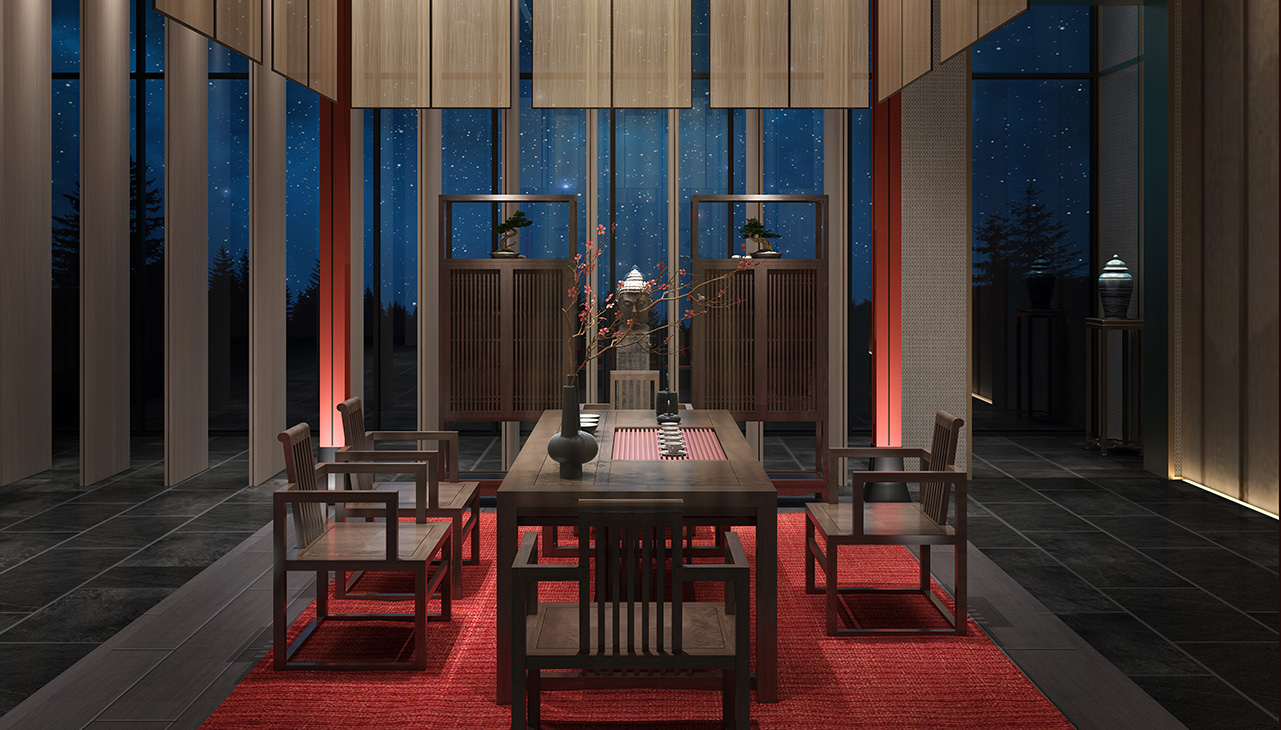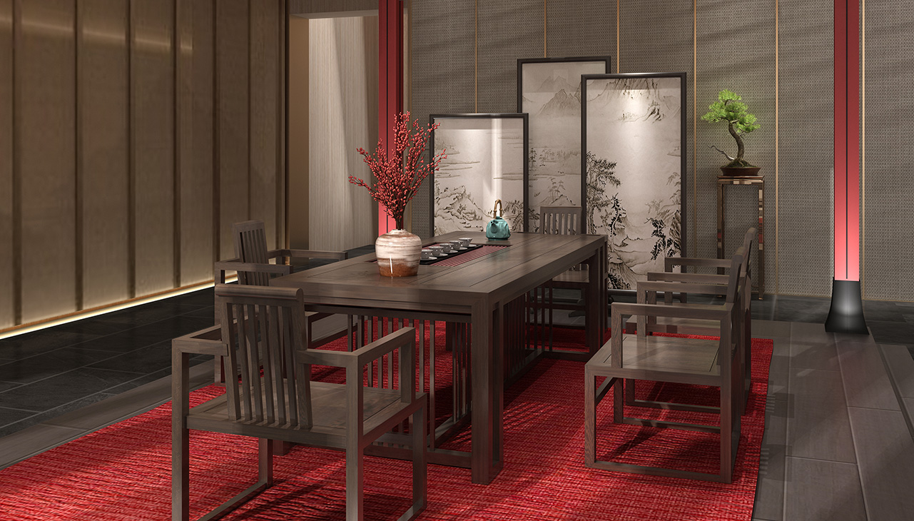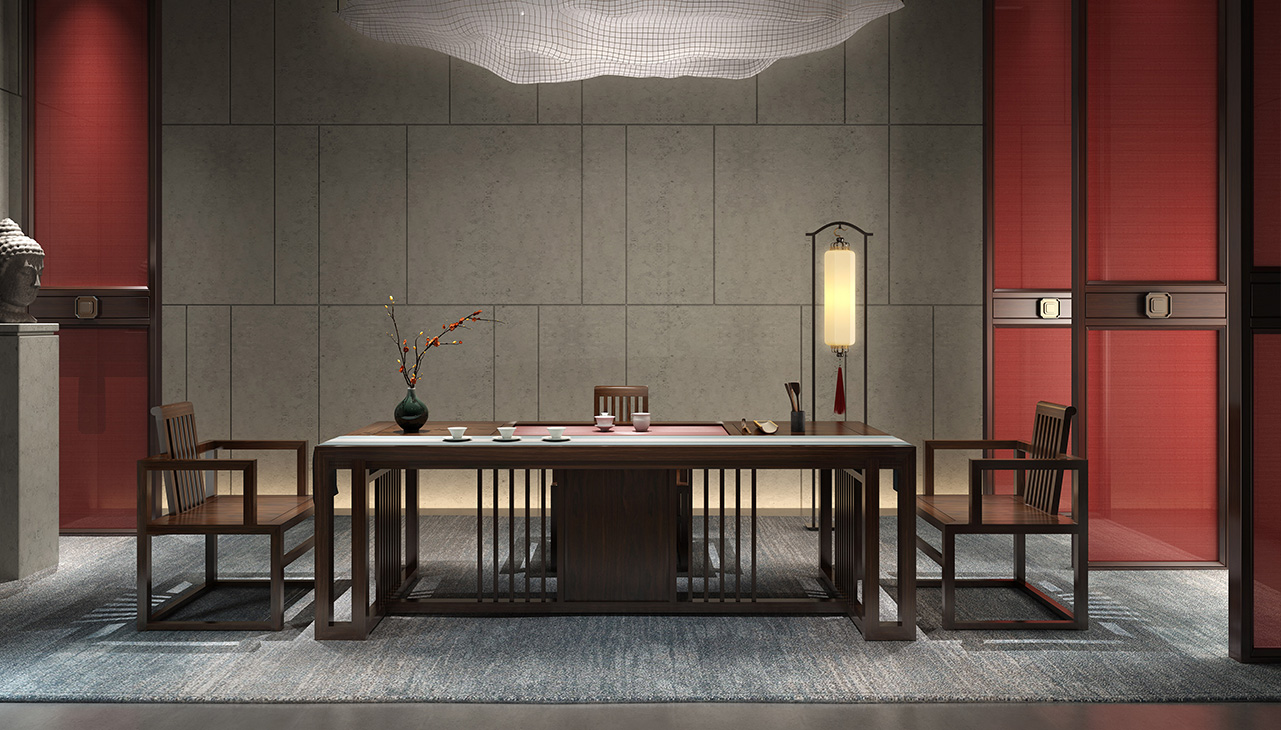 桌下格挡采用格栅+挡板与留白相结合的方式,并依据不同桌体长度调整三种设计元素的尺寸比例,虚实结合,阑珊空灵,在视觉上延展空间,亦能使主客空间分明,避免对坐时可能的尴尬触碰。