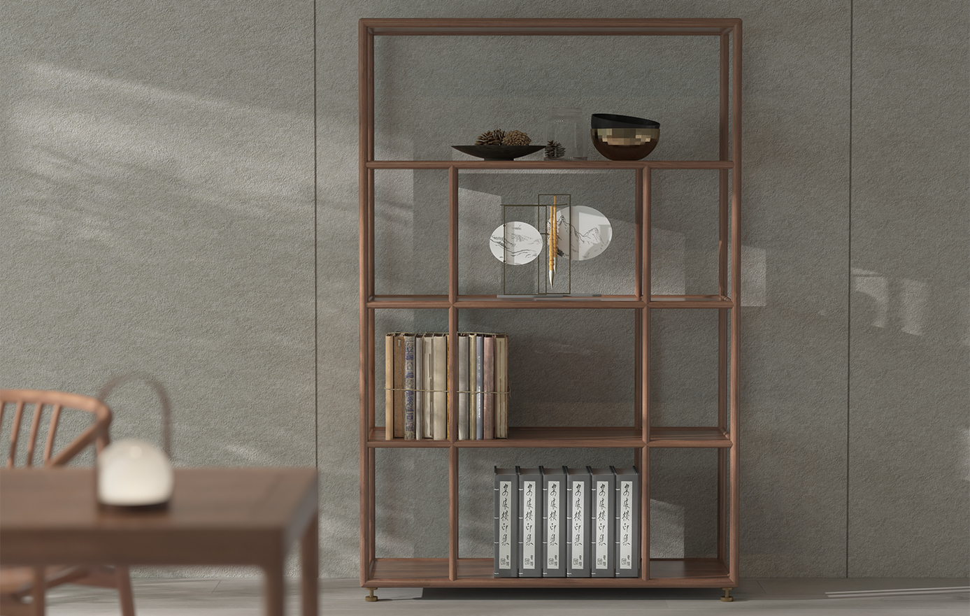 配套柜格为黑胡桃的「澄怀」,博古架呈对称格局,四面敞开,去形凝骨,板面光素。以圆材对空间进行利落分割,其余所有装饰尽数舍去,大面积留白,简到极致,便生出了高雅。